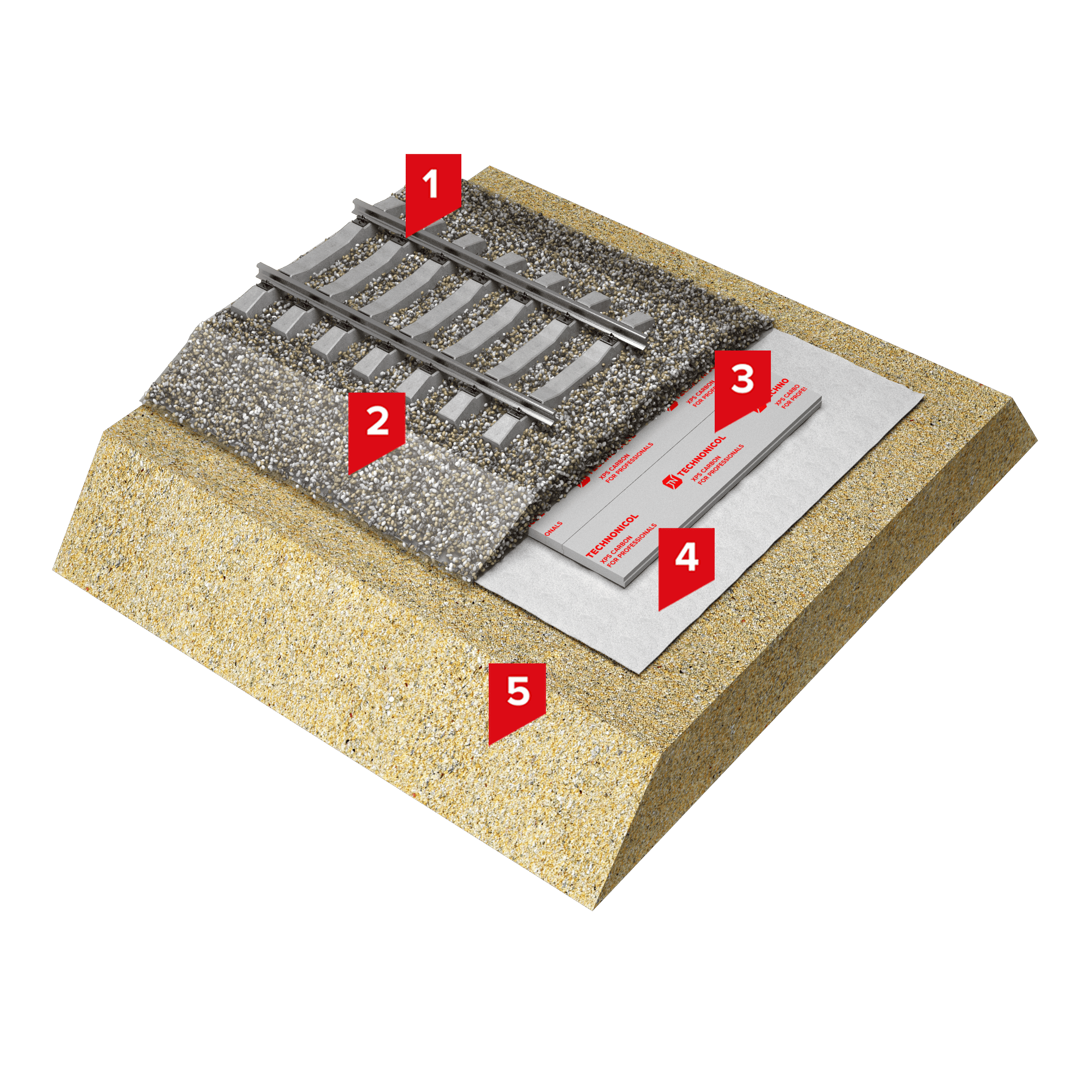 Система применяется для усиления основной площадки земляного полотна на участках, где требуется ликвидация деформаций морозного пучения (пучины; участки с равномерным пучением, превышающим допустимые величины; участки с просадками пути в период оттаивания). В качестве теплоизолирующего слоя, снижающего температурное воздействие на грунты земляного полотна и основания, применяются плиты из экструзионного пенополистирола (Экструзионный пенополистирол ТЕХНОНИКОЛЬ XPS 45-500 или Экструзионный пенополистирол ТЕХНОНИКОЛЬ CARBON SOLID тип A).