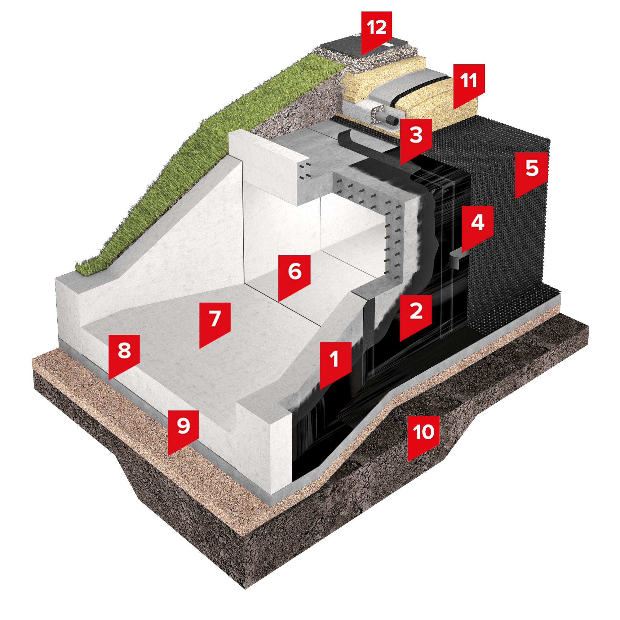 В качестве гидроизоляционного слоя в системе используется битумно-полимерная мастика ТЕХНОНИКОЛЬ №21, которая обеспечивает изоляцию и защиту конструкции от агрессивного воздействия грунтовых и поверхностных вод.