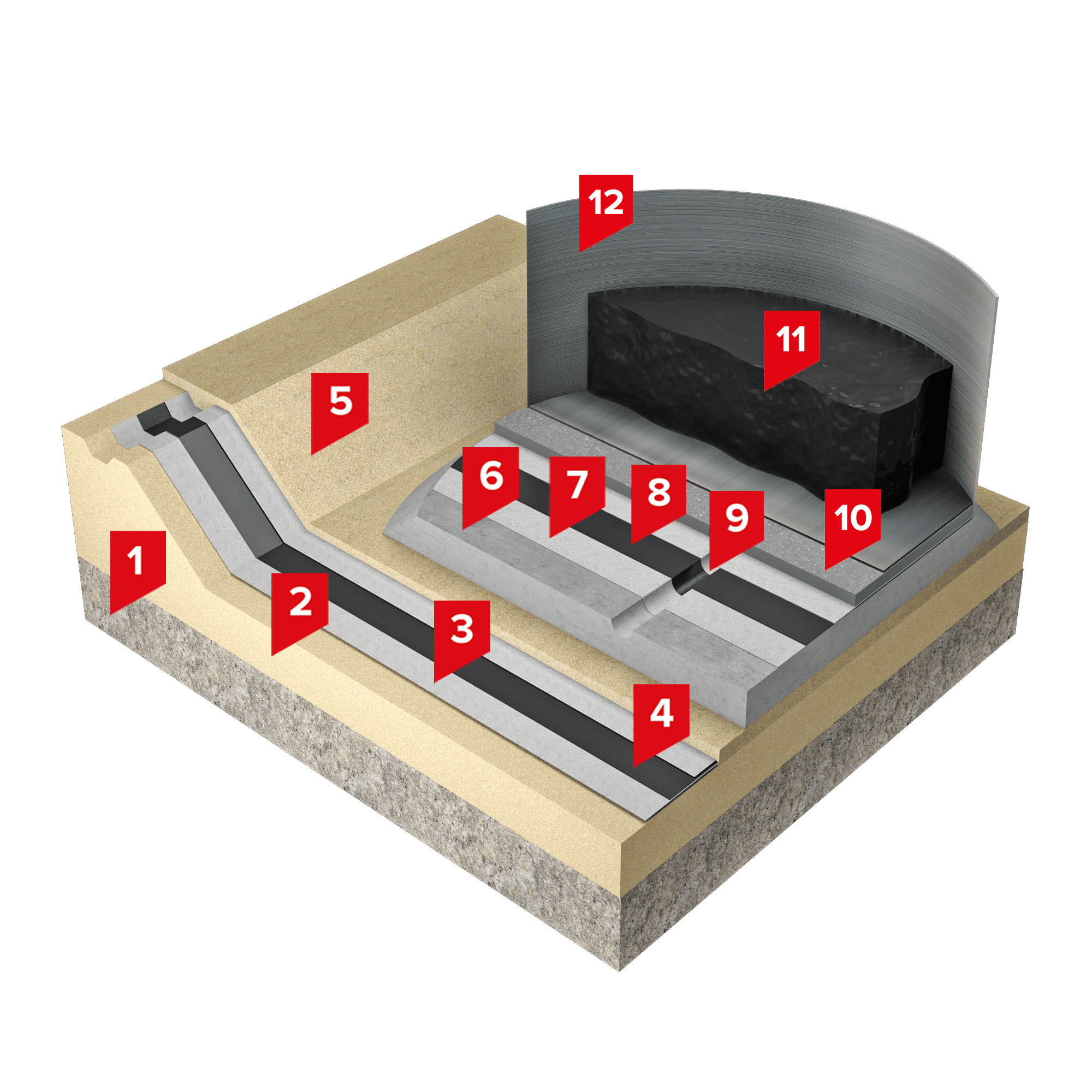 Каждый резервуар выполняется на отдельно стоящем фундаменте с предусмотренной системой гидроизоляции с системой контроля протечек. В случае устройства кольцевого фундамента, пространство внутри кольца заполняется подстилающим слоем песка с формированием уклона 1:100 от центра резервуара к краям. В качестве защитно-разделительного слоя в системе применяется геотекстиль иглопробивной термофиксированный ТЕХНОНИКОЛЬ ПРОФ 500, который укладывается непосредственно на грунтовую подушку. Поверх защитного слоя устраивается основной гидроизоляционный слой из геомембраны ГЕОПРУФ и защищается слоем геотекстиля. По периметру фундамента на расстоянии не более 5 м друг от друга устанавливаются радиальные дренажные трубки диаметром не менее 75 мм с отсыпкой щебнем, закрытые с торцов пластиковой сеткой 10×10 мм на уровне геомембраны. Оставшееся пространство внутри железобетонного кольца заполняется сыпучими материалами (щебень или песок), которые выполняют роль дренирующего слоя. При повреждении гидрофобного слоя под днищем резервуара, содержимое резервуара проходит через дренирующий слой и выходит через дренажные трубки, что сигнализирует о наличии протечек.