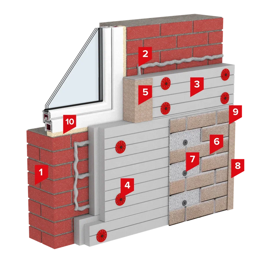 Данное решение подразумевает отсутствие вентиляционного зазора между слоем теплоизоляции и фасадной плиткой, поэтому попадает под ограниченную гарантию 10 лет. При этом, если решение применяется на цоколе при неотапливаемом подвале, гарантия будет составлять 20 лет. При монтаже системы теплоизоляции на стены из газосиликатных блоков, монтаж необходимо производить после завершения всех отделочных работ, связанных с мокрыми процессами, а также после высыхание самих блоков.