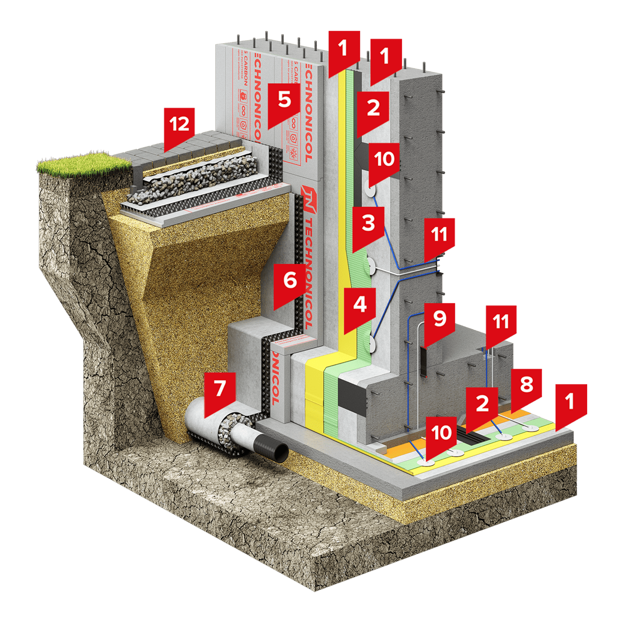 Особенность данной системы – это разделение гидроизоляции на два ремонтопригодных контура. Первый периметр секций площадью до 150 м2 создаётся при помощи гидрошпонок ТЕХНОНИКОЛЬ EC-220-3 (EC-320-4), на вертикальной части рекомендовано использование клеевых лент ПВХ LOGICBASE V-Strip FB. Второй контур герметичных карт такого же размера формируется путем сварки между собой мембран LOGICBASE V-SL и LOGICBASE V-SТ. Проверка целостности всей гидроизоляции на этапе строительства либо эксплуатации фундамента производится методом вакуумного теста. В каждый ремонтопригодный контур и секцию устанавливаются ПВХ контрольно-инъекционные штуцеры и инъекционные трубки в количестве 5 шт., которые позволяют контролировать состояние гидроизоляции и при необходимости проводить ремонт составами LOGICBASE INJECT. Скрепление полотен гидроизоляционной мембраны осуществляется путем сварки нахлестов горячим воздухом при помощи автоматического сварочного оборудования с образованием двойного шва и центрального воздушного канала, который позволяет контролировать герметичность швов. В качестве теплоизоляционного слоя подземной конструкции используется экструзионный пенополистирол ТЕХНОНИКОЛЬ CARBON PROF. Между утеплителем и мембраной LOGICBASE V-SL необходимо предусматривать разделительный слой из геотекстиля с удельной плотностью 500 г/м2. Организация пристенного дренажа, выполненного из профилированной мембраны PLANTER Geo и соединенного с кольцевой дреной, позволяет эффективно отводить воду от сооружения. Для герметизации технологических швов бетонирования в местах сопряжения плиты и стены фундамента применятся специальная ПВХ Гидрошпонка ТЕХНОНИКОЛЬ IC-125-2-SP 4D. Обустройство утепленной мягкой отмостки ТЕХНОНИКОЛЬ позволяет эффективно отводить атмосферную воду от сооружения и не допустить промерзания грунта.