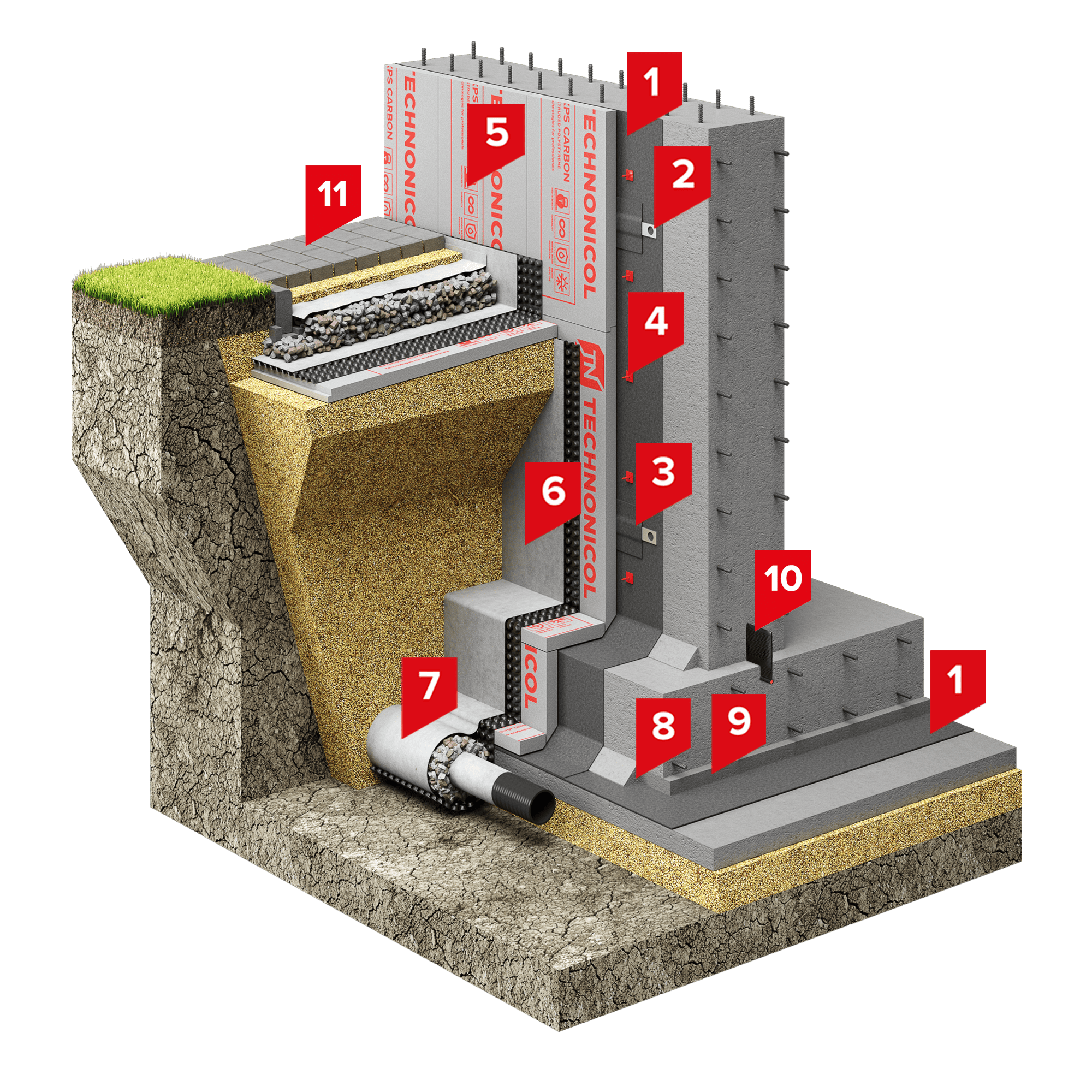В качестве теплоизоляционного слоя подземной части здания используется экструзионный пенополистирол ТЕХНОНИКОЛЬ CARBON PROF, который крепится к гидроизоляционной мембране на специальный крепеж ТЕХНОНИКОЛЬ №01, мастику ТехноНИКОЛЬ №27 или клей-пену ТЕХНОНИКОЛЬ PROFESSIONAL. Также экструзионный пенополистирол выполняет функцию защиты гидроизоляционной мембраны от механического воздействия.