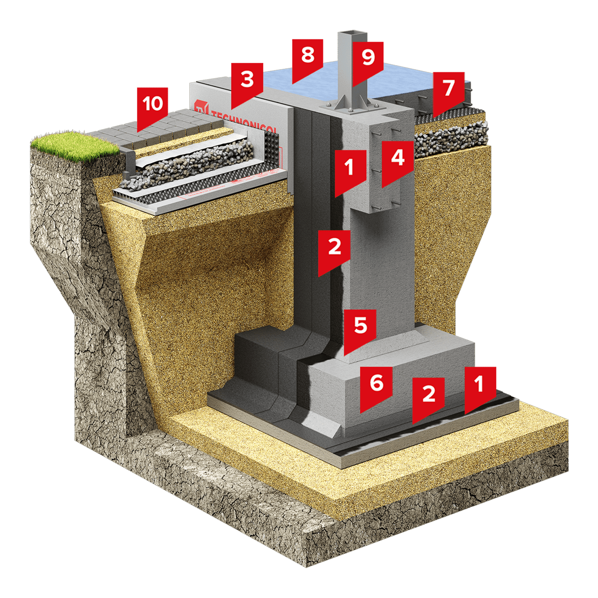 Система применяется для защиты сборных или монолитных подземных конструкций быстровозводимых каркасных зданий в промышленном и гражданском строительстве, а также ленточных фундаментов.