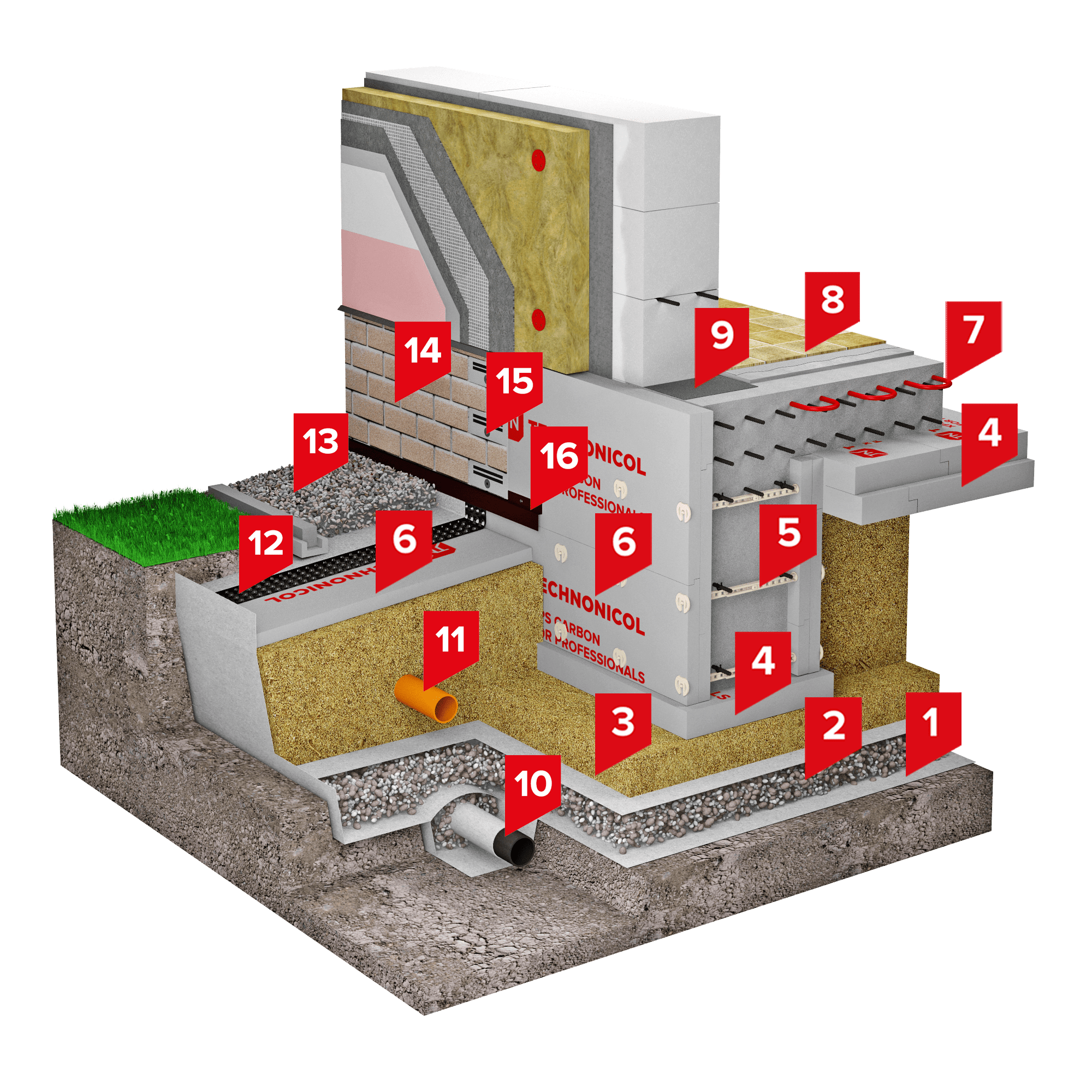 В качестве теплоизоляционного материала для вертикальной части фундамента и отмостки используется экструзионный пенополистирол марки ТЕХНОНИКОЛЬ CARBON ECO, который обладает низким водопоглощением и высокой прочностью на сжатие. Под подошвой фундамента и в конструкции пола используется экструзионный пенополистирол марки ТЕХНОНИКОЛЬ CARBON ECO SP, обладающий повышенными прочностными показателями. Технология несъемной опалубки с применением экструзионного пенополистирола XPS ТЕХНОНИКОЛЬ CARBON ECO и модульных элементов стяжек для несъемной опалубки позволяет выполнять фундаментную ленту необходимой ширины под любой тип стен. Технология позволяет производить бетонирование в одну захватку, сокращая временные затраты и количество технологических операций при возведении фундамента.