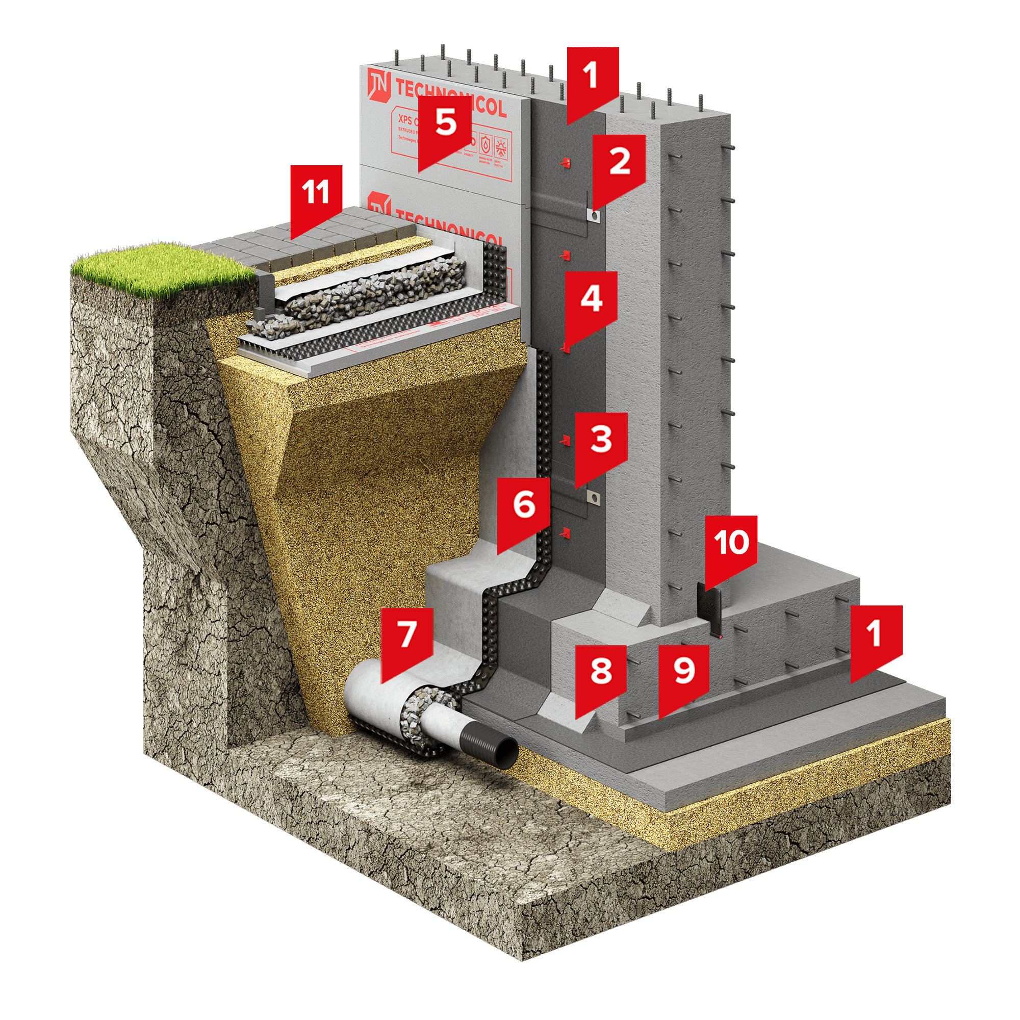 Для устройства гидроизоляционной мембраны применяется битумно-полимерный рулонный материал Техноэласт ФУНДАМЕНТ ТЕРРА в один слой, который укладывается на основание свободно со сплавлением швов. На вертикальной поверхности Техноэласт ФУНДАМЕНТ ТЕРРА крепится к основанию алюминиевой прижимной рейкой ТехноНИКОЛЬ Стандарт (РМ) 2 м или круглыми тарельчатыми держателями ТехноНИКОЛЬ 50, которые перекрываются бандажом из битумно-полимерного рулонного материала.