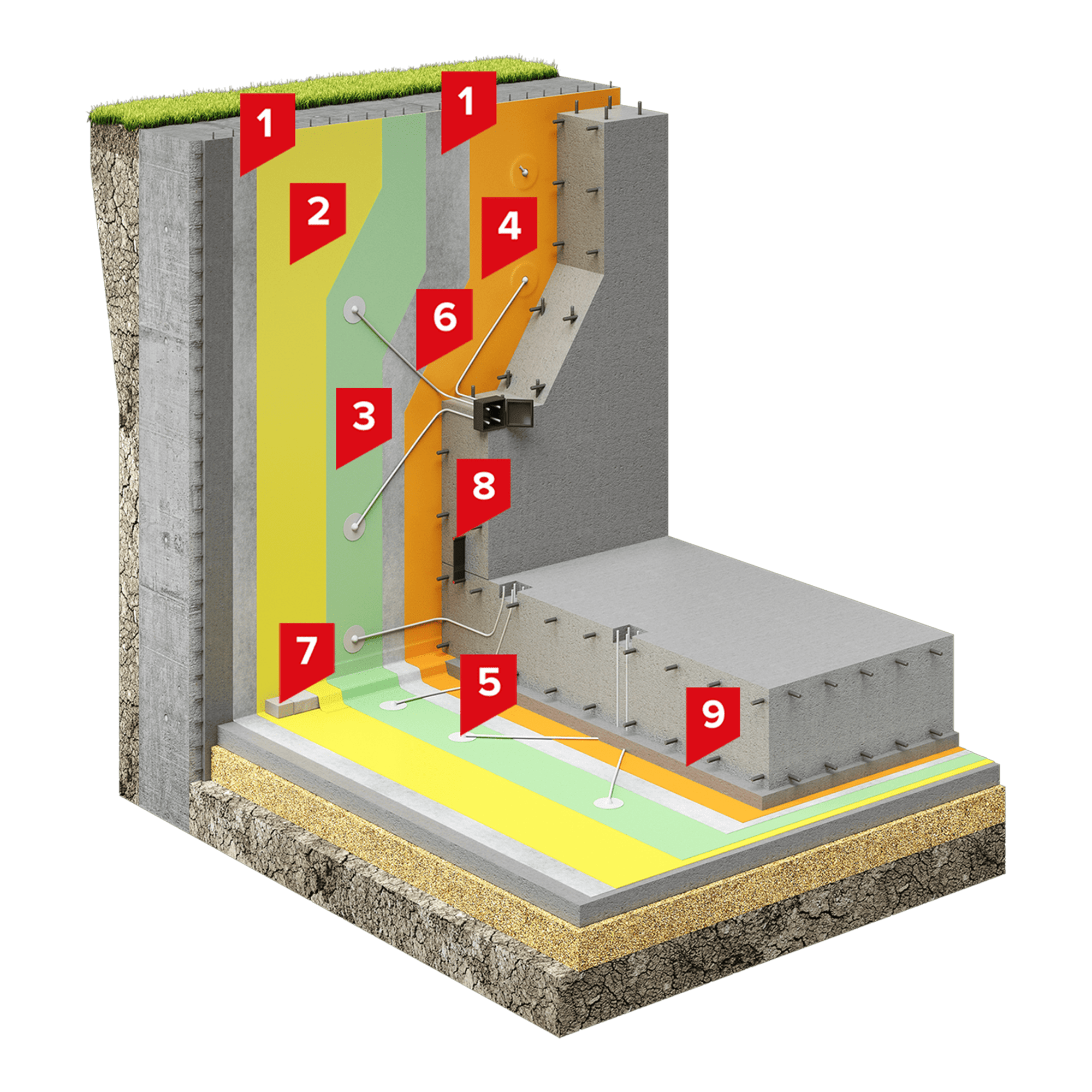 В качестве защитного и разделительного слоя в системе используется геотекстиль с поверхностной плотностью 500 г/м2. На горизонтальной части фундамента дополнительно предусмотрен слой полиэтиленовой плёнки и защитной цементно-песчаной стяжки.