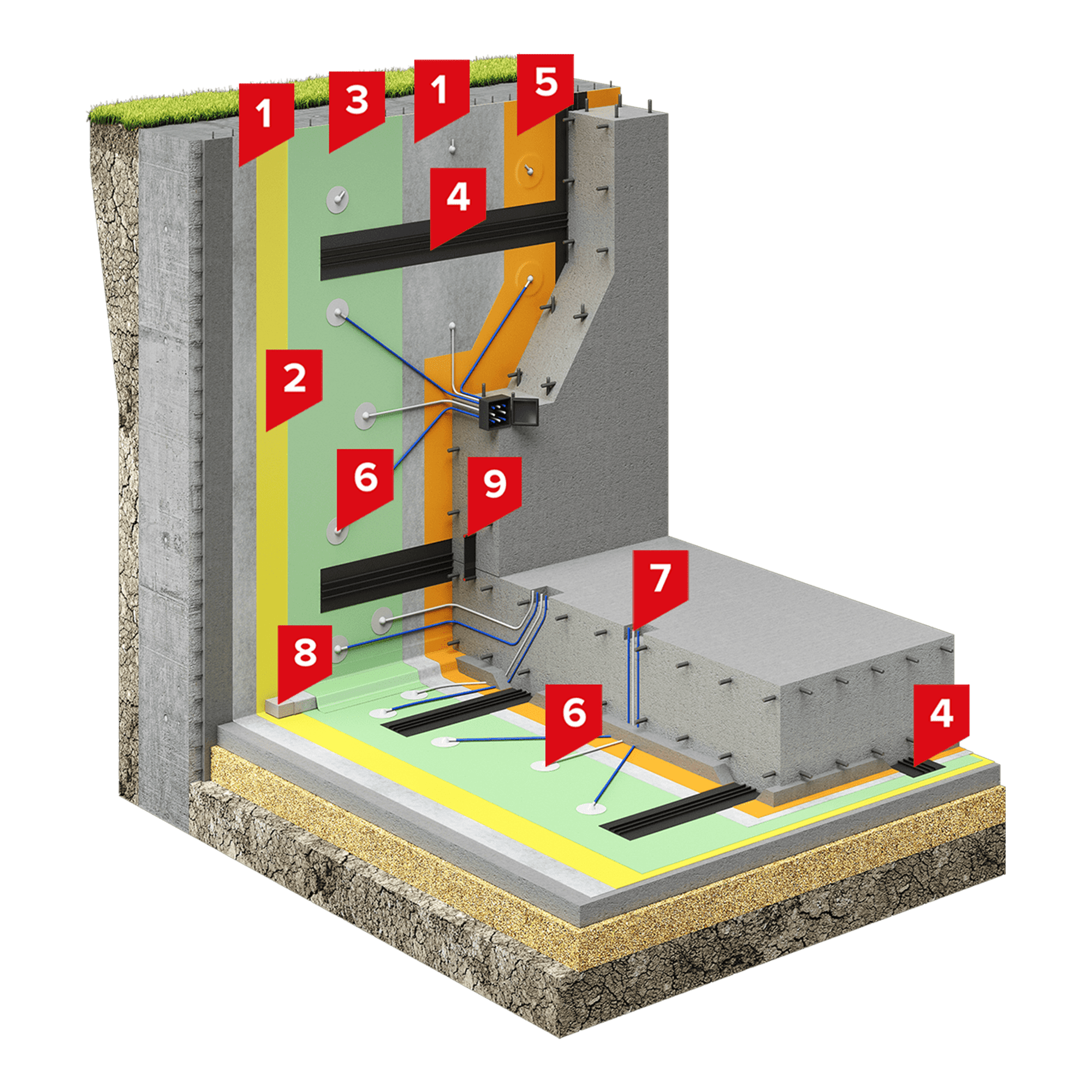 Система применяется для гидроизоляции подземных строительных конструкций различного назначения и класса ответственности, возводимых в котлованах с вертикальным ограждением (стена в грунте) в любых гидрогеологических условиях.