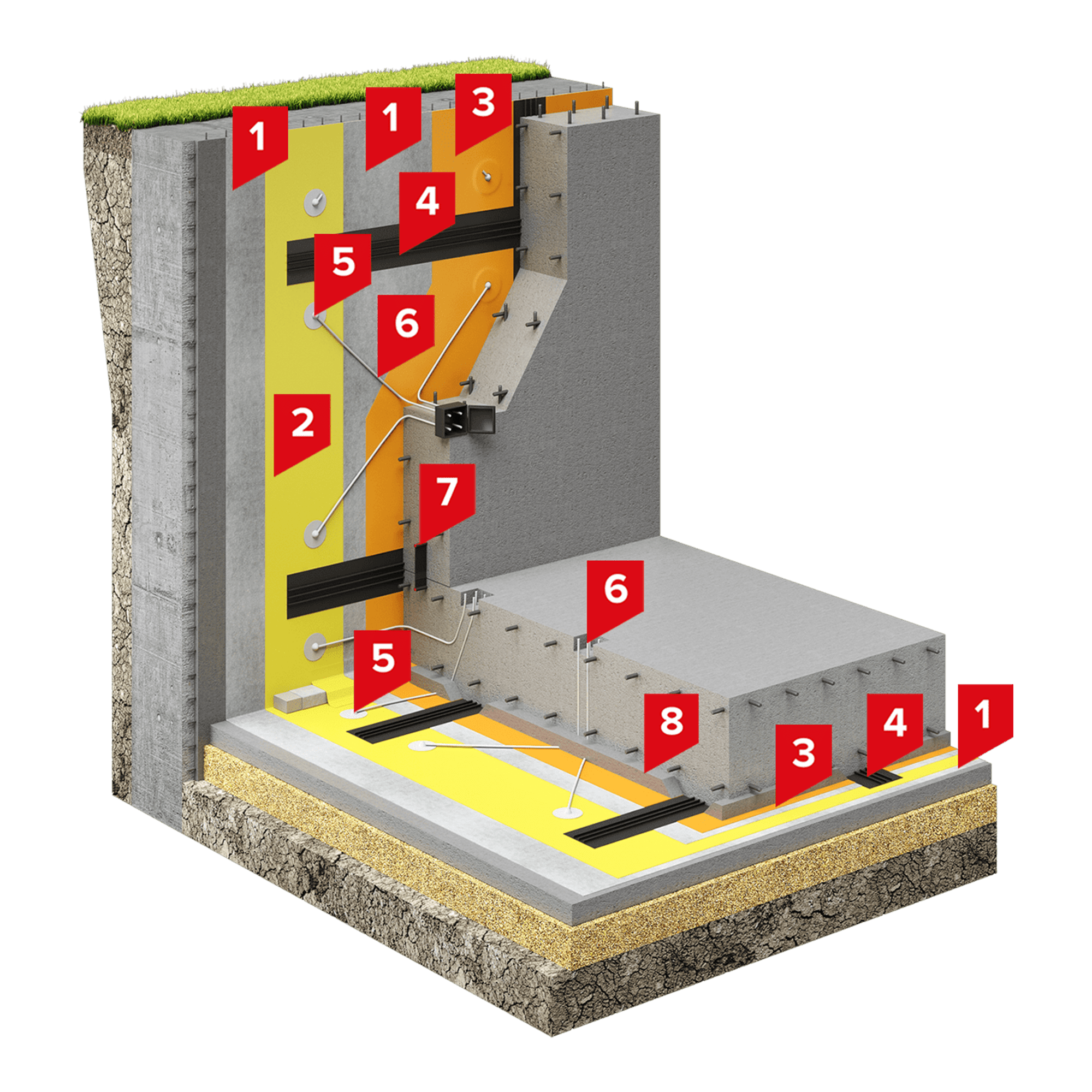 Особенность данной системы – это разделение гидроизоляционного слоя на секции площадью до 150 м² при помощи гидрошпонок ТЕХНОНИКОЛЬ EC-220-3 (EC-320-4), на вертикальной части рекомендовано использование клеевых лент ПВХ LOGICBASE V-Strip FB. В каждую карту устанавливаются ПВХ контрольно-инъекционные штуцеры и инъекционные трубки в количестве 5 шт., которые позволяют контролировать состояние гидроизоляции и при необходимости проводить ремонт составами LOGICBASE INJECT.