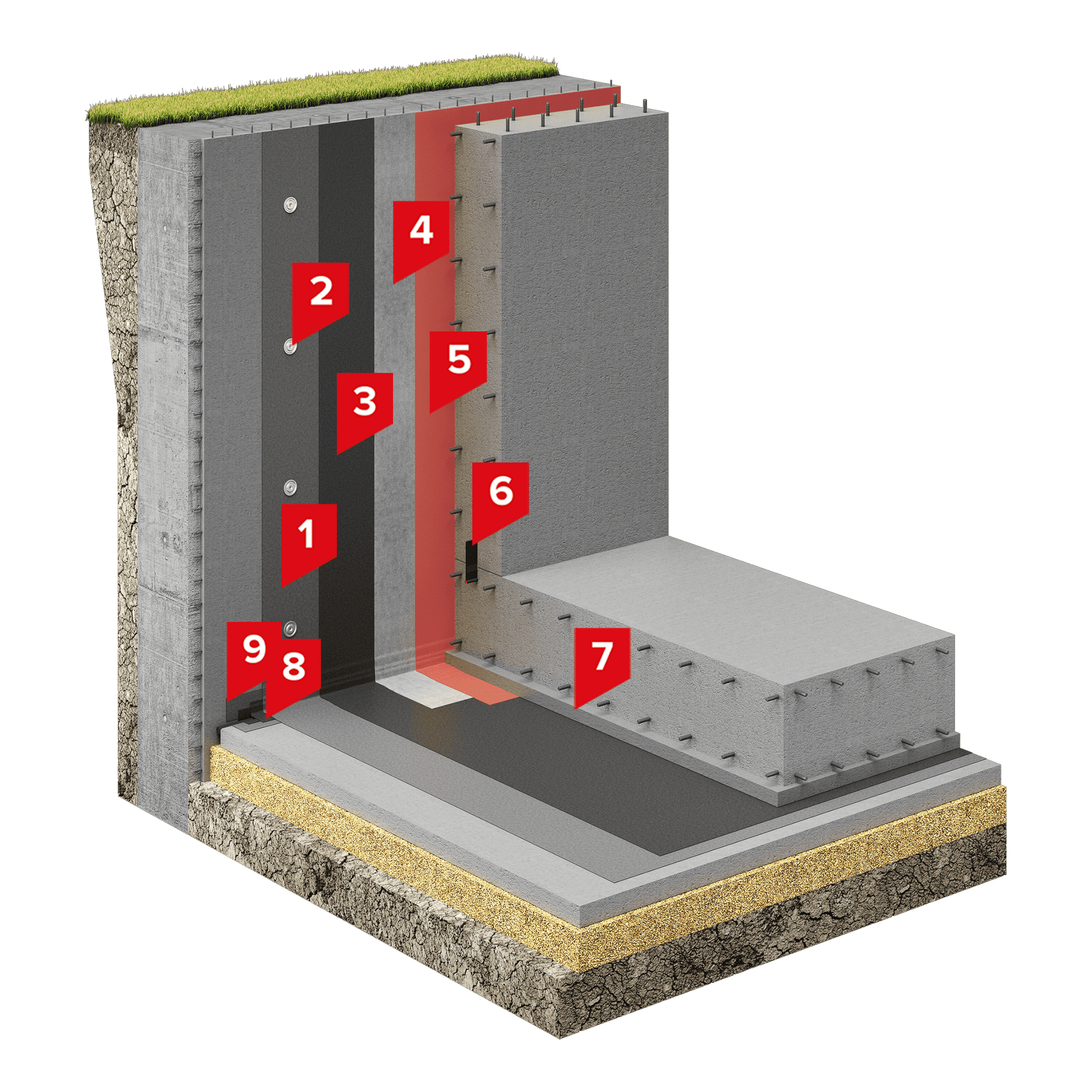 Система применяется для гидроизоляции подземных строительных конструкций различного назначения и класса ответственности, возводимых в котлованах с вертикальным ограждением (стена в грунте) в любых гидрогеологических условиях.