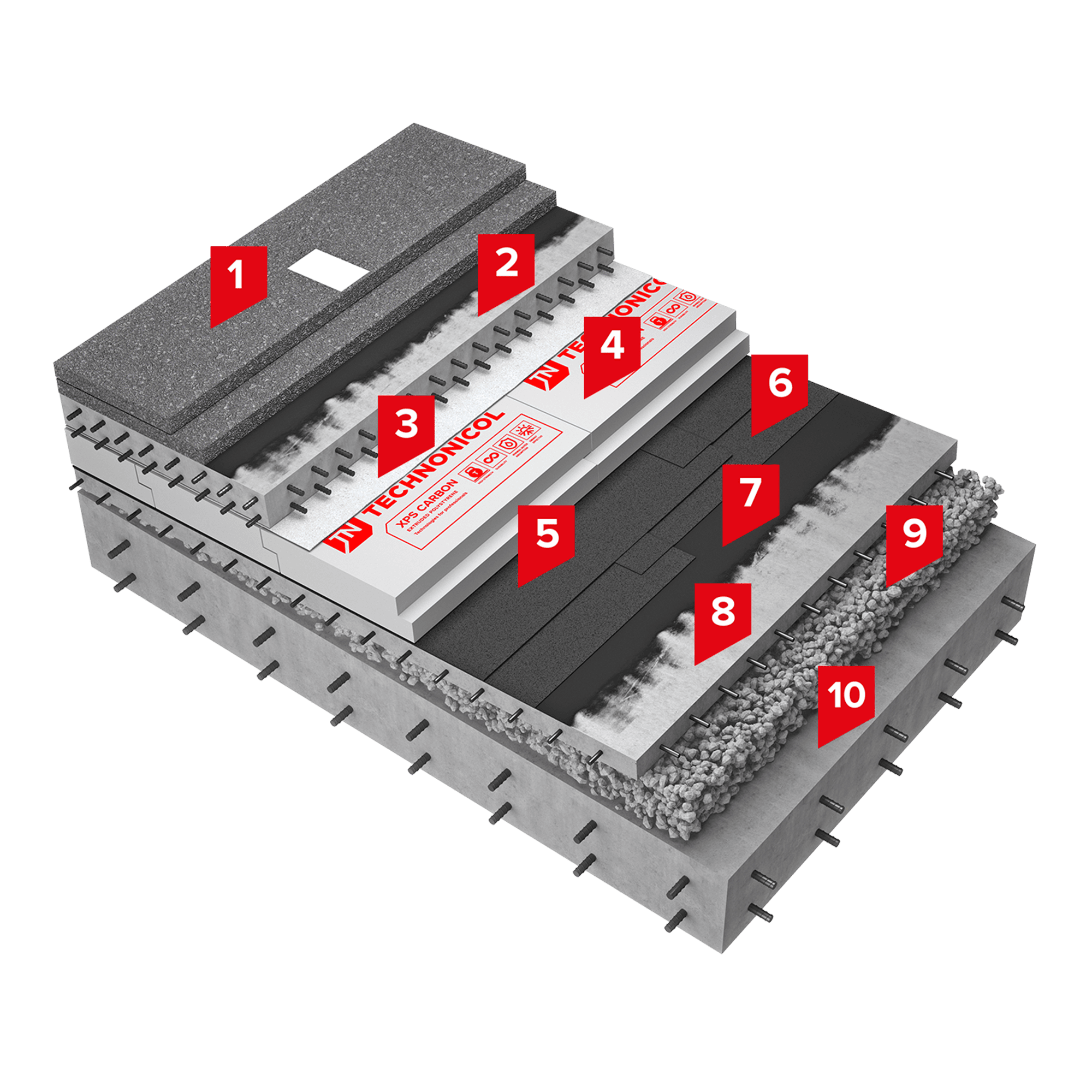 Для устройства теплоизоляционного слоя применяется материал XPS ТЕХНОНИКОЛЬ CARBON SOLID 500 отличающийся высокими теплоизолирующими характеристиками и повышенной прочностью на сжатие (прочность на сжатие не менее 500 кПа).