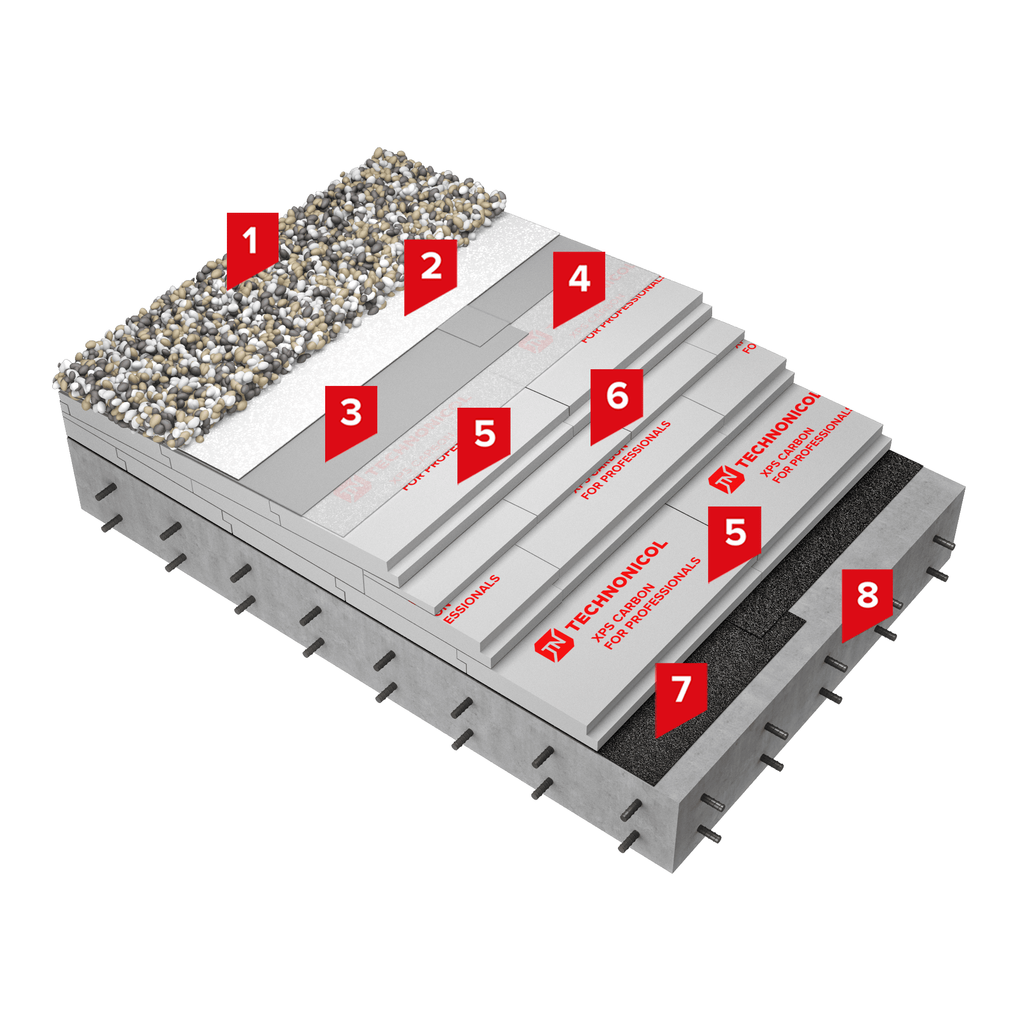 В качестве балласта в системе рекомендуется использовать - гальку окатанную промытую, фракцией 20–40 мм или гранитный щебень, фракцией 20–40 мм. Кровельный ковер выполняется из полимерной мембраны LOGICROOF V-GR, армированная стеклохолстом, которая обладает повышенной устойчивостью на прокол. Для дополнительной защиты полимерной мембраны от проколов на неё укладывается иглопробивной термоофиксированный геотекстиль ТЕХНОНИКОЛЬ ПРОФ КРОВЛЯ 300 развесом не менее 300 г/м2 и только затем балластный слой. Для устройства теплоизоляционного слоя применяется утеплитель на основе экструзионного пенополистирола ТЕХНОНИКОЛЬ CARBON ECO, отличающийся высокими теплоизолирующими характеристиками и повышенной прочностью на сжатие. Между ПВХ мембранной и экструзионным пенополистиролом необходимо предусмотреть разделительный слой – стеклохолст, развесом не менее 100 г/м2. В качестве пароизоляции по бетонному основанию применяется наплавляемый материал Технобарьер.