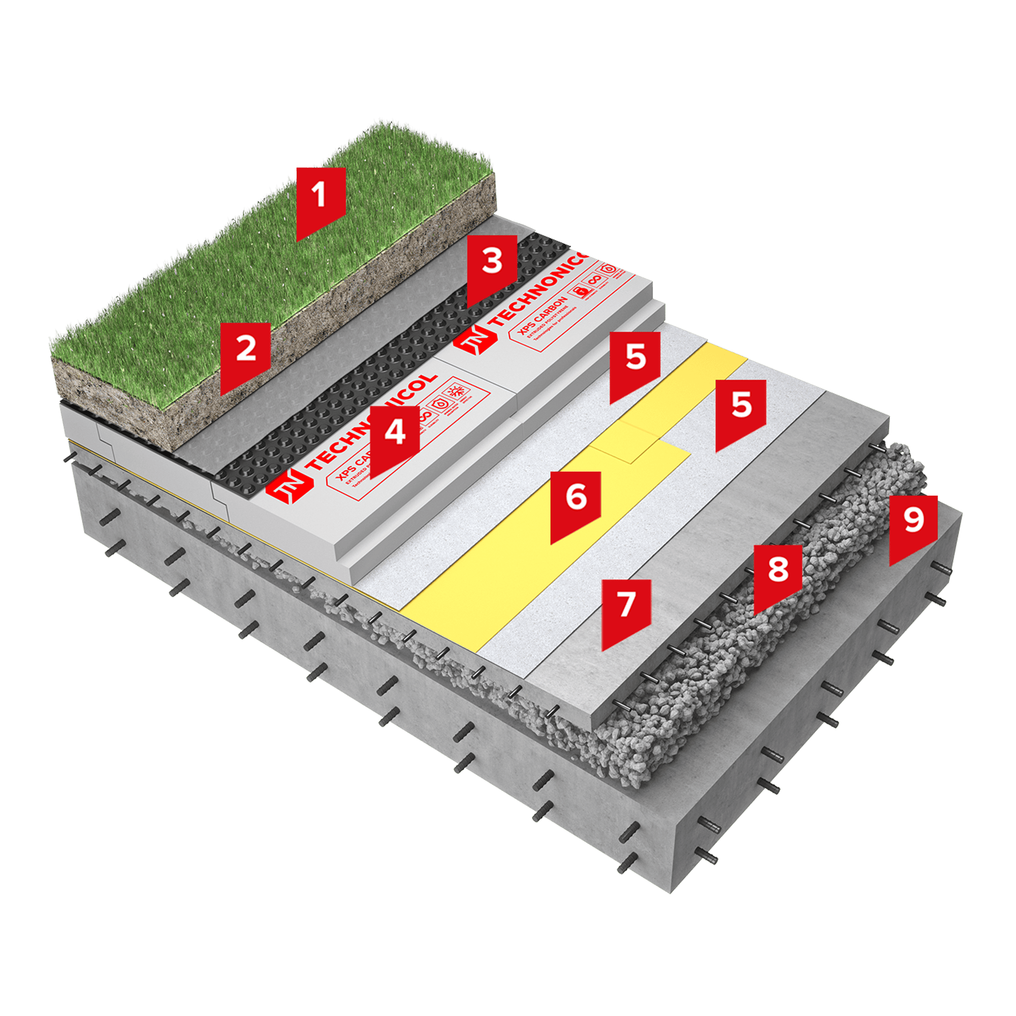 В системе ТН-КРОВЛЯ Барьер Грин поверх несущего железобетонного основания формируется уклонообразующий слой из керамзитобетона. Далее укладывается выравнивающая цементно-песчаная стяжка. В качестве подстилающего слоя применяется геотекстильное полотно плотностью не менее 300 г/м². Поверх подстилающего слоя монтируется водоизоляционный слой из полимерной мембраны LOGICBASE V-SL, которая обеспечивает высокую скорость монтажных работ, а также гарантирует возможность инструментального контроля герметичности швов. Далее укладывают утеплитель на основе экструзионного пенополистирола ТЕХНОНИКОЛЬ CARBON PROF в один слой. Между ПВХ мембранной и экструзионным пенополистиролом необходимо укладывать разделительный слой из геотекстильного полотна плотностью не менее 300 г/м². Поверх утеплителя XPS для обеспечения максимально быстрого удаления влаги из-под поверхности эксплуатируемого слоя устраивается дренажный слой из профилированной мембраны PLANTER Geo. Далее укладывается растительный грунт либо субстрат, толщина и вид которого подбираются с учетом требований для выбранных зеленых насаждений.