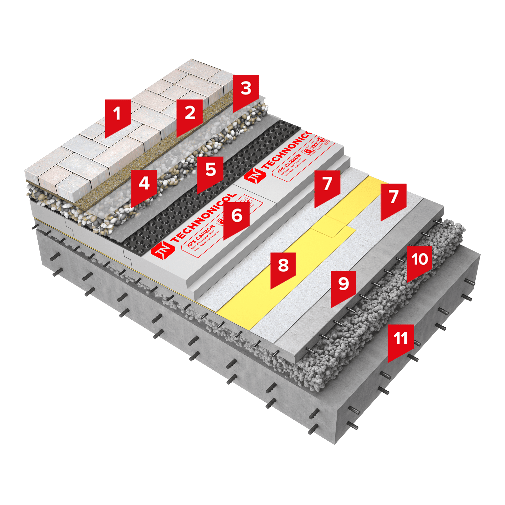 В системе ТН-КРОВЛЯ Барьер Тротуар поверх несущего железобетонного основания формируется уклонообразующий слой из керамзитобетона. Далее укладывается выравнивающая цементно-песчаная стяжка. В качестве подстилающего слоя применяется геотекстильное полотно плотностью не менее 300 г/м². Поверх подстилающего слоя монтируется водоизоляционный слой из полимерной мембраны LOGICBASE V-SL, которая обеспечивает высокую скорость монтажных работ, а также гарантирует возможность инструментального контроля герметичности швов. Далее укладывают утеплитель на основе экструзионного пенополистирола ТЕХНОНИКОЛЬ CARBON PROF в один слой. Между ПВХ мембранной и экструзионным пенополистиролом необходимо укладывать разделительный слой из геотекстильного полотна плотностью не менее 300 г/м². Поверх утеплителя XPS для обеспечения максимально быстрого удаления влаги из-под поверхности эксплуатируемого слоя устраивается дренажный слой из профилированной мембраны PLANTER Geo. Для комфортного пребывания и перемещения по покрытию кровли устраивают выравнивающий слой из щебня (гравия) фракции 5-20 мм. В качестве подстилающего слоя под укладки плитки рекомендуется укладывать слой из песка либо мелкого гравия толщиной 30-50 мм. В качестве финишного покрытия является тротуарная плитка любых модификаций, используемая при благоустройстве жилых зон и отличающаяся высокой морозостойкостью и стойкостью к пешеходным нагрузкам. Технология укладки плитки выбирается в соответствии с рекомендациями производителя.