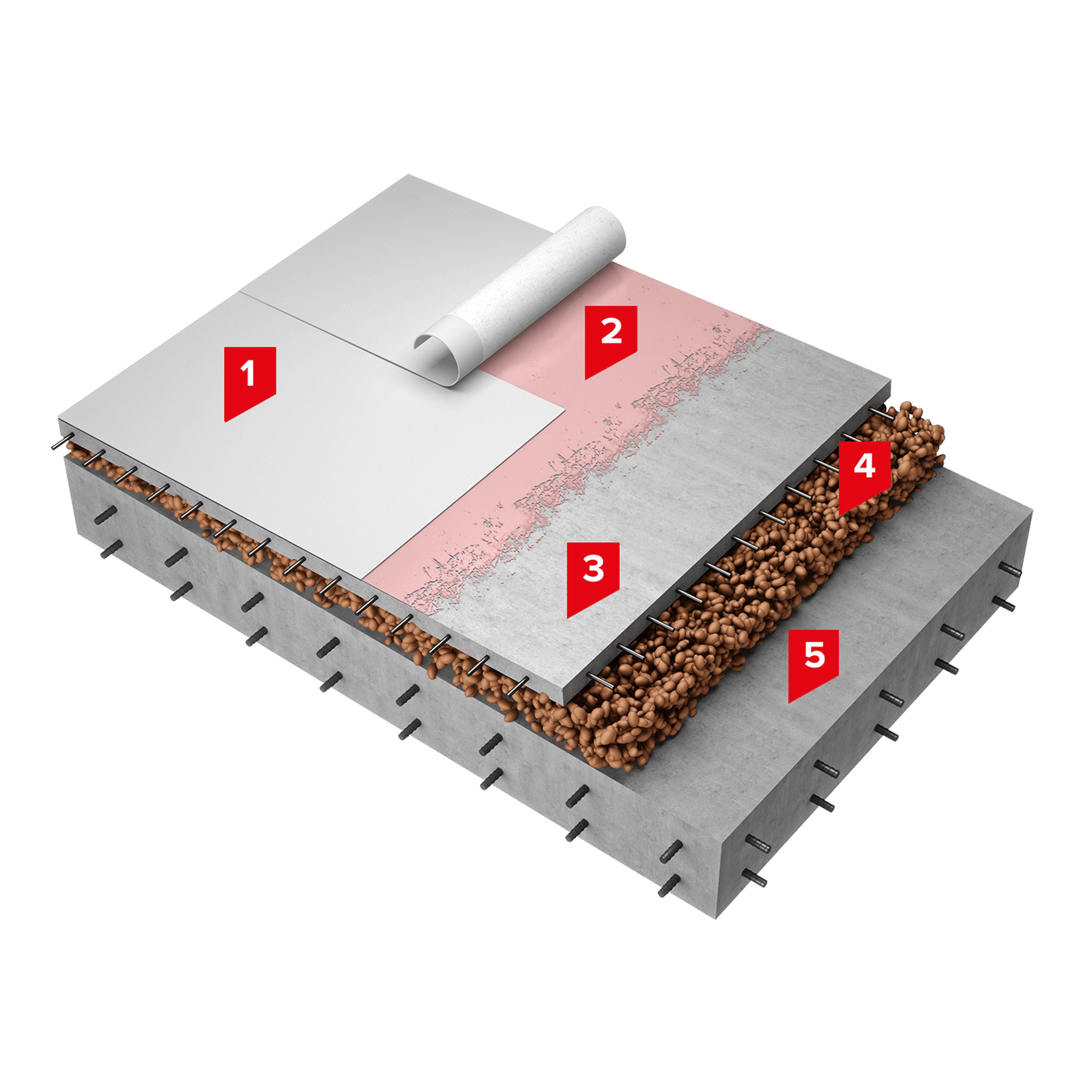 Кровельный ковер выполняется из полимерной мембраны LOGICROOF V-GR FB с флисовой подложкой из ламинированного геотекстиля, которая приклеивается к армированной цементно-песчаной стяжке при помощи Контактного клея LOGICROOF Bond. Для приклеивания мембраны в зимних условиях при температуре от минус 15 °С до плюс 5°С необходимо применять Контактный клей LOGICROOF Bond Arctic. Для создания уклона по железобетонному основанию используется слой из керамзита, поверх которого устраивается армированная цементно-песчаная стяжка. Благодаря высоким противопожарным характеристики мембраны – Г3, РП1 и В2, конструкция соответствует группе пожарной опасности кровли КП0, что позволяет применять систему на кровлях любых площадей.