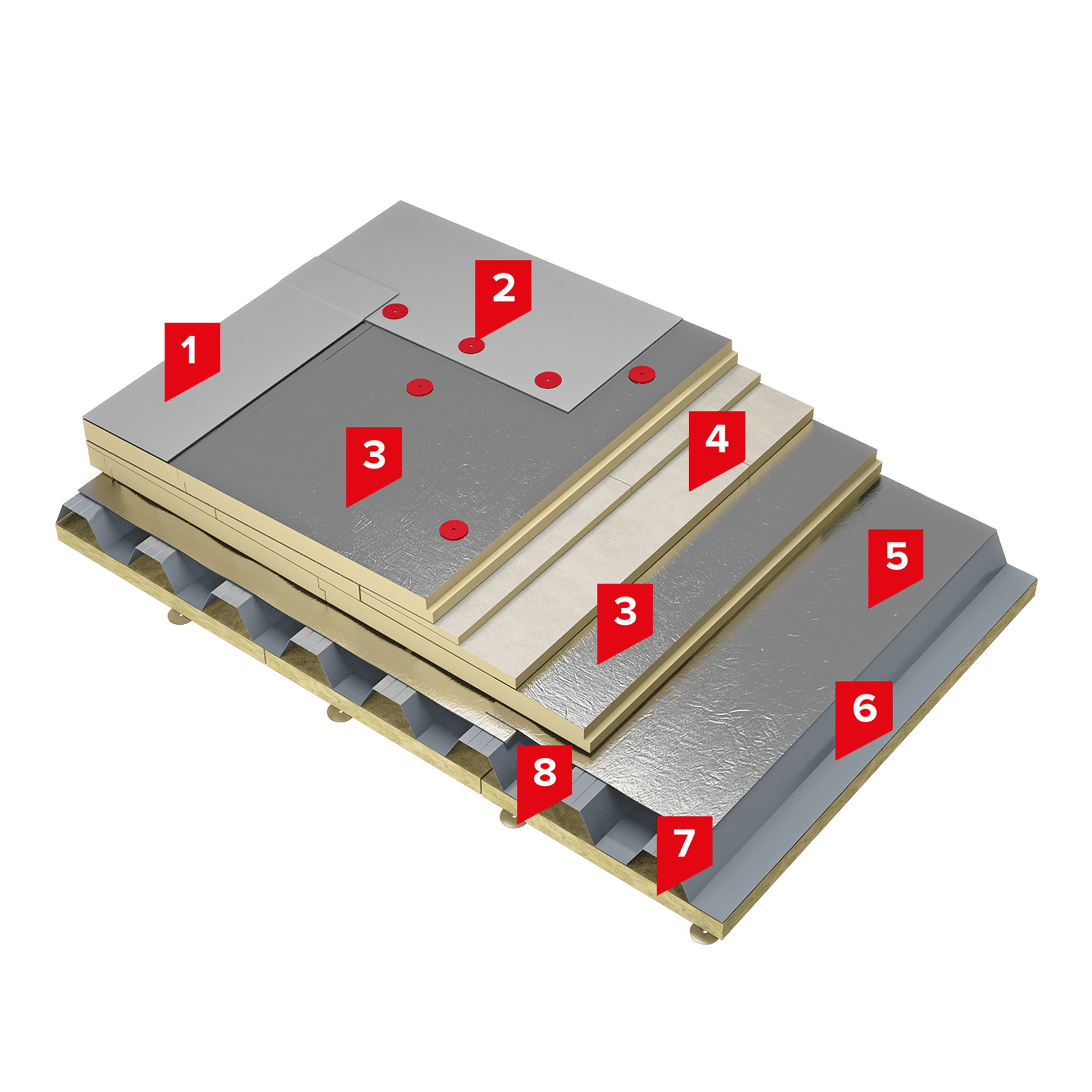 Кровельный ковер выполняется из полимерной мембраны LOGICROOF V-RP, которая имеет высокие противопожарные характеристики – Г2, РП1 и В2. В случае применения ПВХ мембран ТехноНИКОЛЬ конструкция соответствует группе пожарной опасности кровли КП0, что позволяет применять систему без ограничений по площади кровли. Для устройства теплоизоляционного слоя применяются плиты на основе жесткого пенополиизоцианурата LOGICPIR PROF Ф/Ф, имеющие группу горючести Г1. За счет низкой теплопроводности теплоизоляции, толщина и общий вес системы значительно снижены, по сравнению с системами с традиционным утеплителем. Высокая прочность и стойкость плит LOGICPIR PROF Ф/Ф к сосредоточенным нагрузкам повышает межремонтный срок службы кровли. В целях обеспечения высоких показателей пожарной безопасности по нижнему поясу профилированного настила механически закрепляется слой огнезащитного материала из каменной ваты марки ТЕХНО ОЗМ. В качестве пароизоляции по профилированному настилу применяется алюминизированная мембрана Паробарьер С (А500 или Ф1000). В зависимости от условий эксплуатации, типа объекта, условий влажности в помещении может быть выбрана определенная марка пароизоляционного материала: