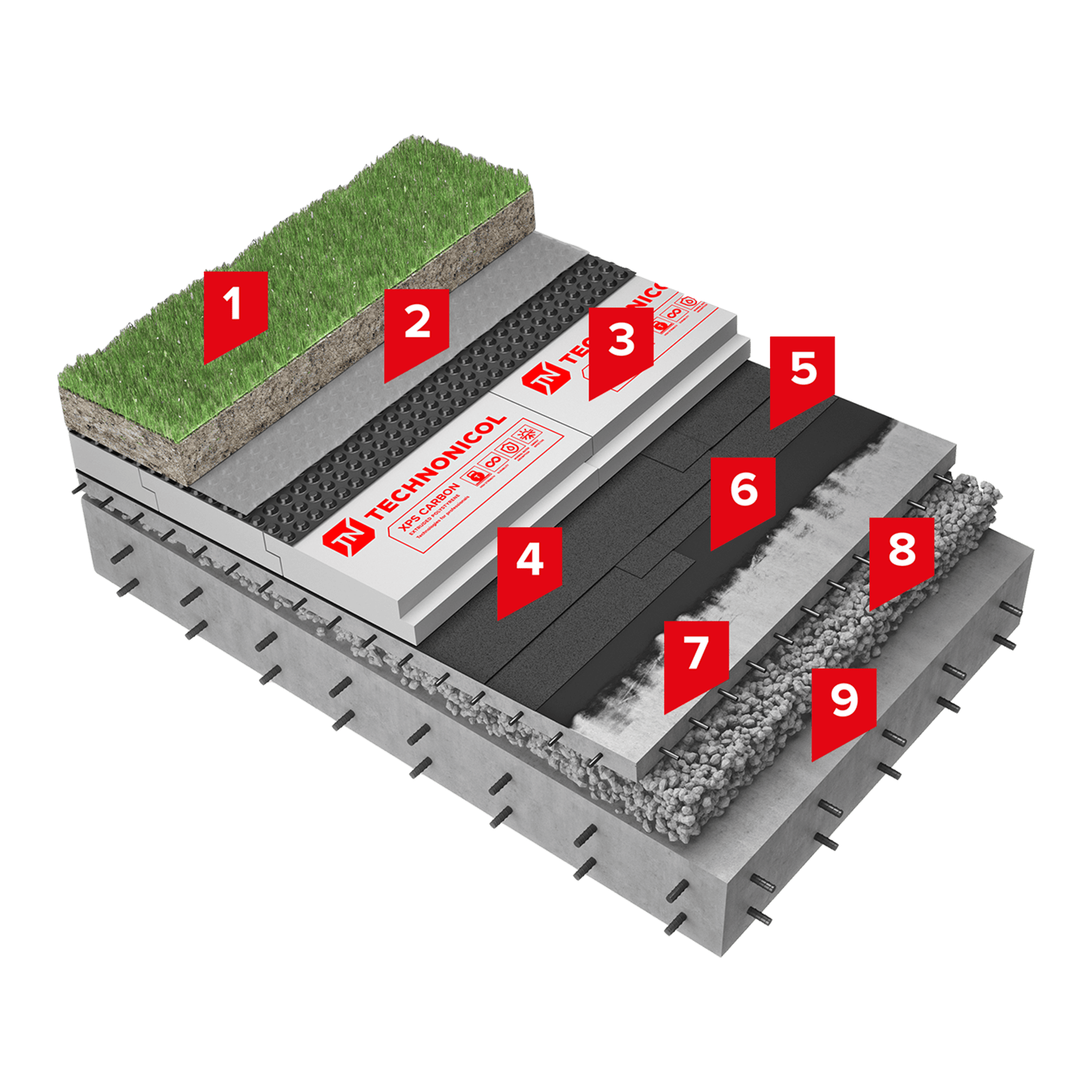 В качестве основного слоя теплоизоляции применяется утеплитель экструзионный пенополистирол ТЕХНОНИКОЛЬ CARBON PROF, отличающийся высокими теплоизолирующими характеристиками, низким водопоглощением и повышенной прочностью на сжатие, что соответствует требованиям предъявляемых к теплоизоляционным материалам в инверсионных крышах согласно п.5.4.3 СП 17.13330.2017.