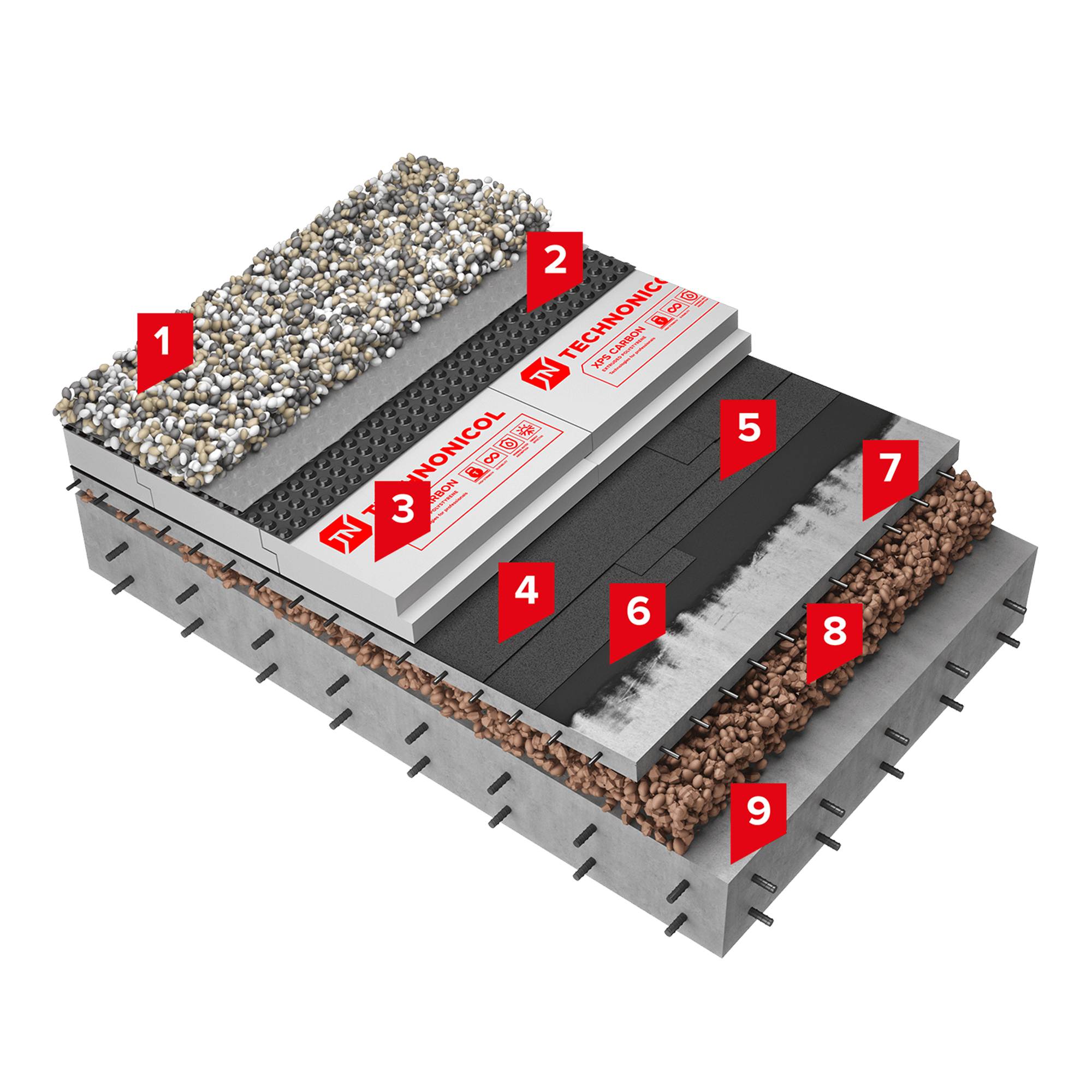 В качестве теплоизоляционного слоя используется экструзионный пенополистирол ТЕХНОНИКОЛЬ CARBON PROF, отличающийся низким водопоглощением и высокой прочностью на сжатие, что соответствует требованиям предъявляемых к теплоизоляционным материалам в инверсионных крышах согласно п.5.4.3 СП 17.13330.2017.