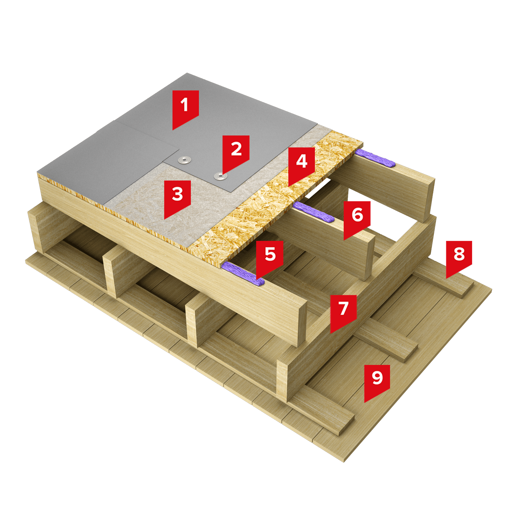 Сплошное основание в системе организовано из листов ОСП (18 мм) или фанеры ФСФ (12 мм), приклеенных к деревянным балкам полиуретановым клеем ТЕХНОНИКОЛЬ 508 PROFESSIONAL.