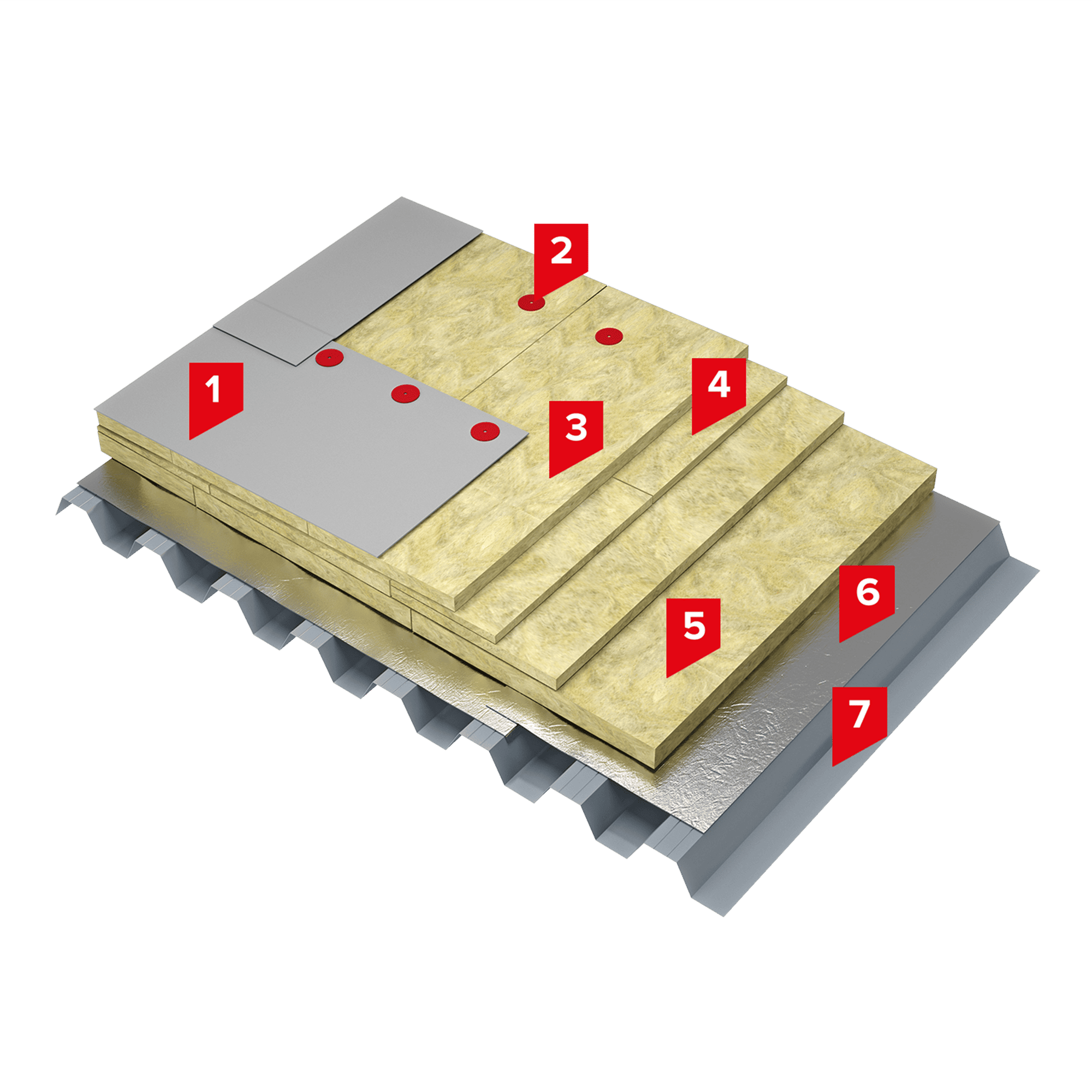 Для устройства теплоизоляционного слоя применяется две марки утеплителя на основе каменной ваты. ТЕХНОРУФ В ЭКСТРА – более прочный утеплитель, применяемый для устройства верхнего слоя теплоизоляции, который перераспределят внешнюю нагрузку на нижний слой теплоизоляции. Плиты ТЕХНОРУФ Н ПРОФ имеют меньшую прочность на сжатие и применяется для устройства нижнего слоя теплоизоляции, что позволяет сэкономить на общей стоимости утеплителя.