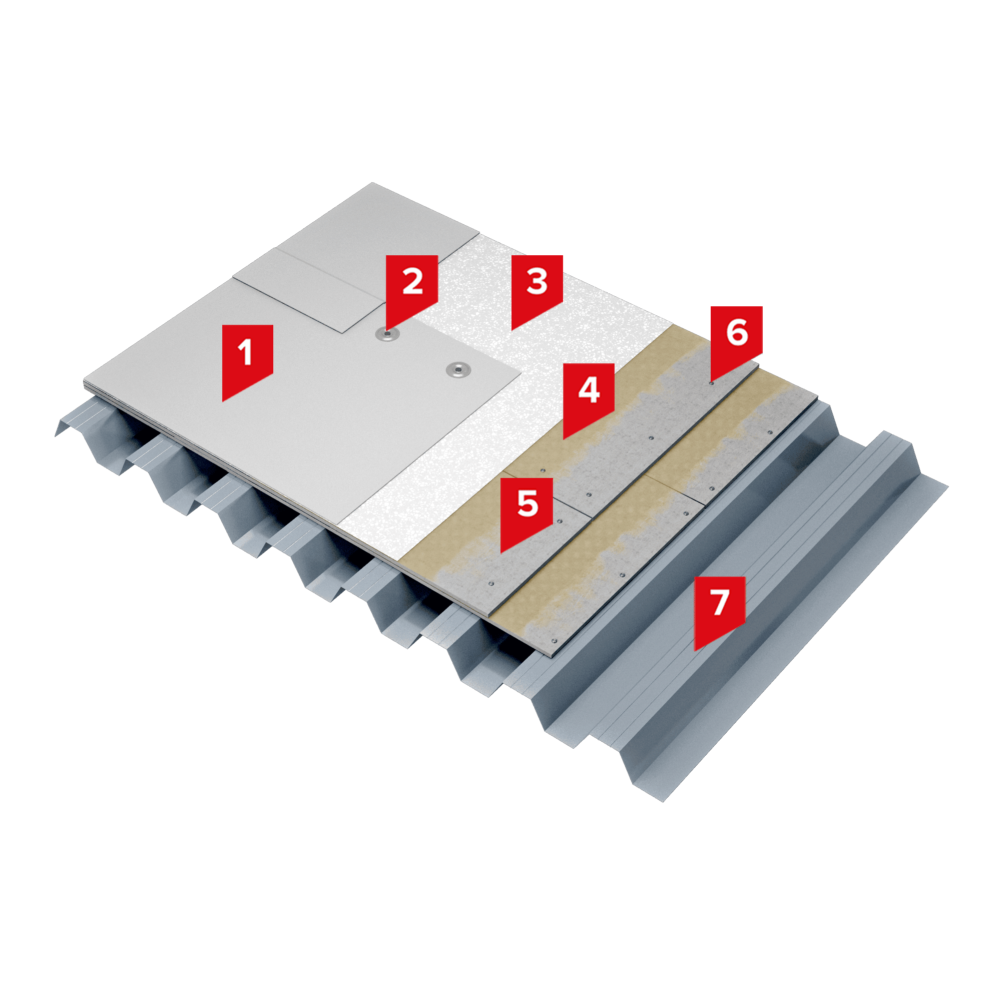 Система неэксплуатируемой крыши по комбинированному основанию из стального профилированного настила и сборной стяжки из плитных материалов с механическим методом крепления кровельного ковра из полимерной мембраны без устройства теплоизоляционного слоя.