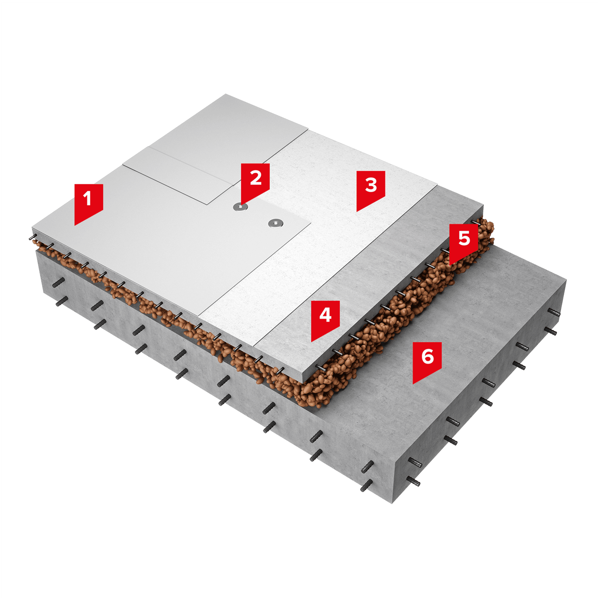 Между цементной стяжкой и полимерной мембраной необходимо предусмотреть разделительный слой из иглопробивного термофиксированного геотекстиля ТЕХНОНИКОЛЬ ПРОФ КРОВЛЯ 300. Для создания уклона по железобетонному основанию используется слой из керамзита, поверх которого устраивается армированная цементно-песчаная стяжка.