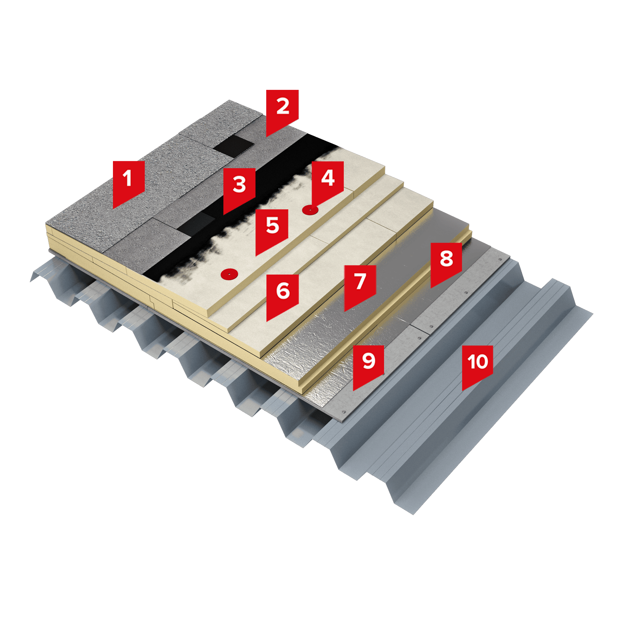В качестве верхнего слоя теплоизоляции применяется утеплитель на основе жесткого пенополиизоцианурата LOGICPIR PROF СХМ/СХМ, отличающийся высокими теплоизолирующими характеристиками и поверхностной жесткостью.