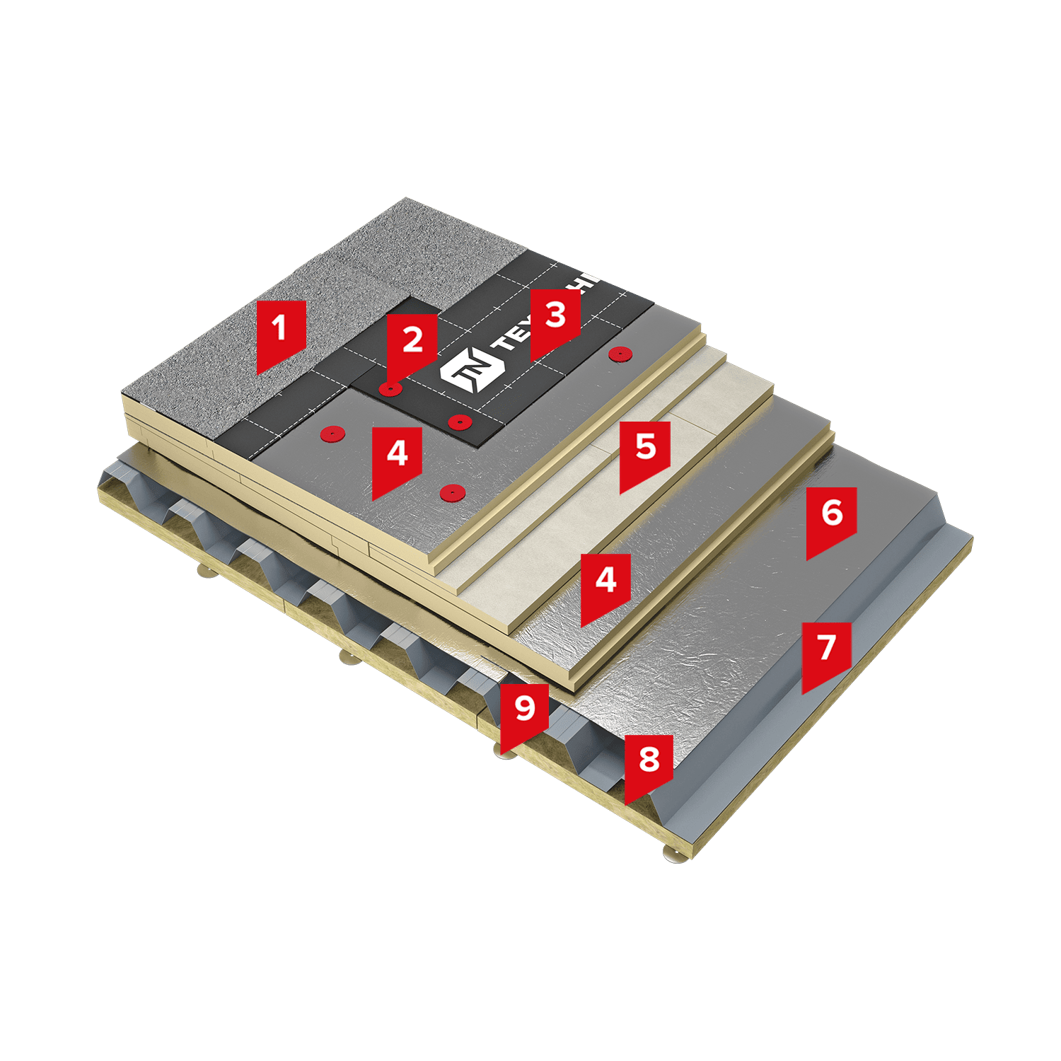 Кровельный ковер состоит из двух слоев битумно-полимерного материала. Нижний слой Техноэласт ФИКС крепится к основанию механически крепежными элементами ТехноНИКОЛЬ. Верхний слой из битумно-полимерного материала Техноэласт ПЛАМЯ СТОП (с повышенными противопожарными характеристиками – РП1, В2) наплавляется на нижний слой кровли. Благодаря применению двухслойной битумно-полимерной гидроизоляции система имеет высокую поверхностную механическую прочность и надежность.