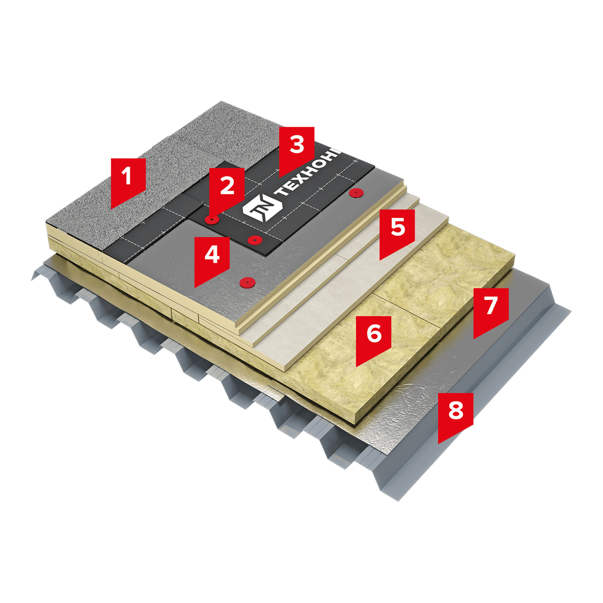В качестве нижнего слоя теплоизоляции применяются негорючие плиты из каменной ваты ТЕХНОРУФ Н ПРОФ толщиной не менее 50 мм, что обеспечивает системе высокие противопожарные характеристики. В качестве верхнего слоя теплоизоляции применяется утеплитель на основе жесткого пенополиизоцианурата LOGICPIR PROF Ф/Ф, отличающийся высокими теплоизолирующими характеристиками и поверхностной жесткостью.