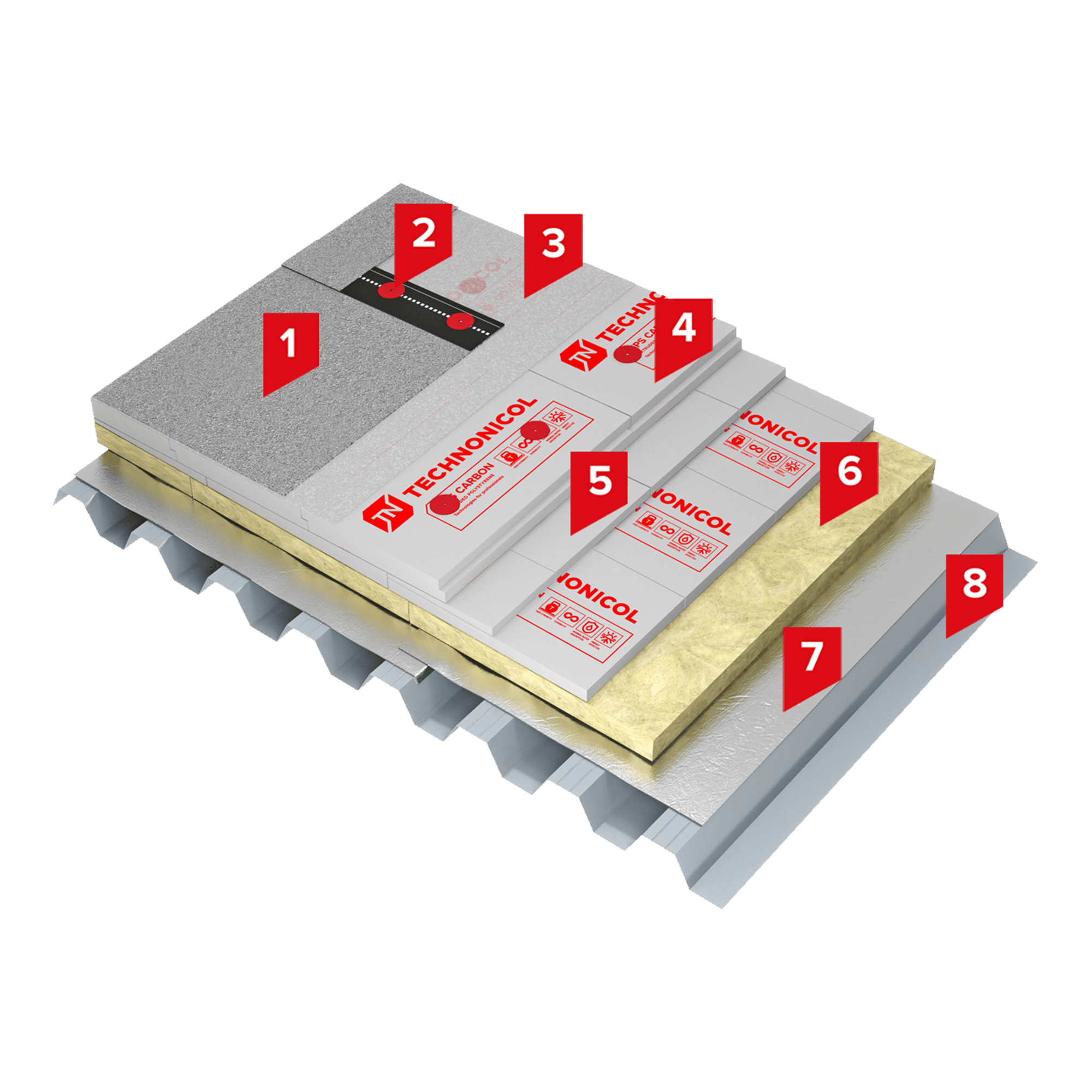 В качестве верхнего слоя теплоизоляции применяется утеплитель на основе экструзионного пенополистирола ТЕХНОНИКОЛЬ CARBON PROF, отличающийся высокими теплоизолирующими характеристиками и повышенной прочностью на сжатие. Между водоизоляционным ковром и экструзионным пенополистиролом необходимо уложить разделительный слой – стеклохолст, развесом не менее 100 г/м².