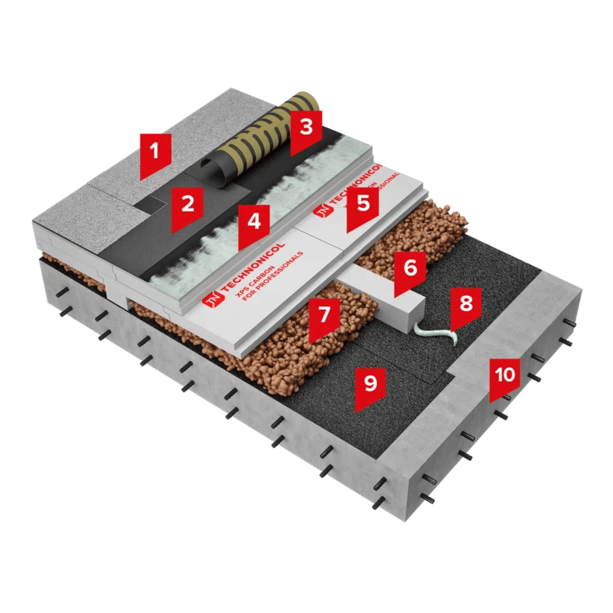 В конструкции применены в качестве нижнего слоя теплоизоляционные плиты из экструзионного пенополистирола ТЕХНОНИКОЛЬ CARBON PROF, в качестве верхнего теплоизоляционного слоя - экструзионный пенополистирол Сэндвич ТЕХНОНИКОЛЬ Ц-XPS. Теплоизоляционные плиты укладываются свободно. Панели теплоизоляционные «XPS Сэндвич ТЕХНОНИКОЛЬ Ц-XPS» представляют собой плиты из экструзионного пенополистирола, покрытые защитным слоем из высокопрочной цементной стяжки. Наличие защитного слоя из высокопрочной цементной стяжки избавляет от необходимости устраивать сборную или цементно-песчаную стяжку, значительно упрощая монтаж и обеспечивает отличные эксплуатационные свойства.
