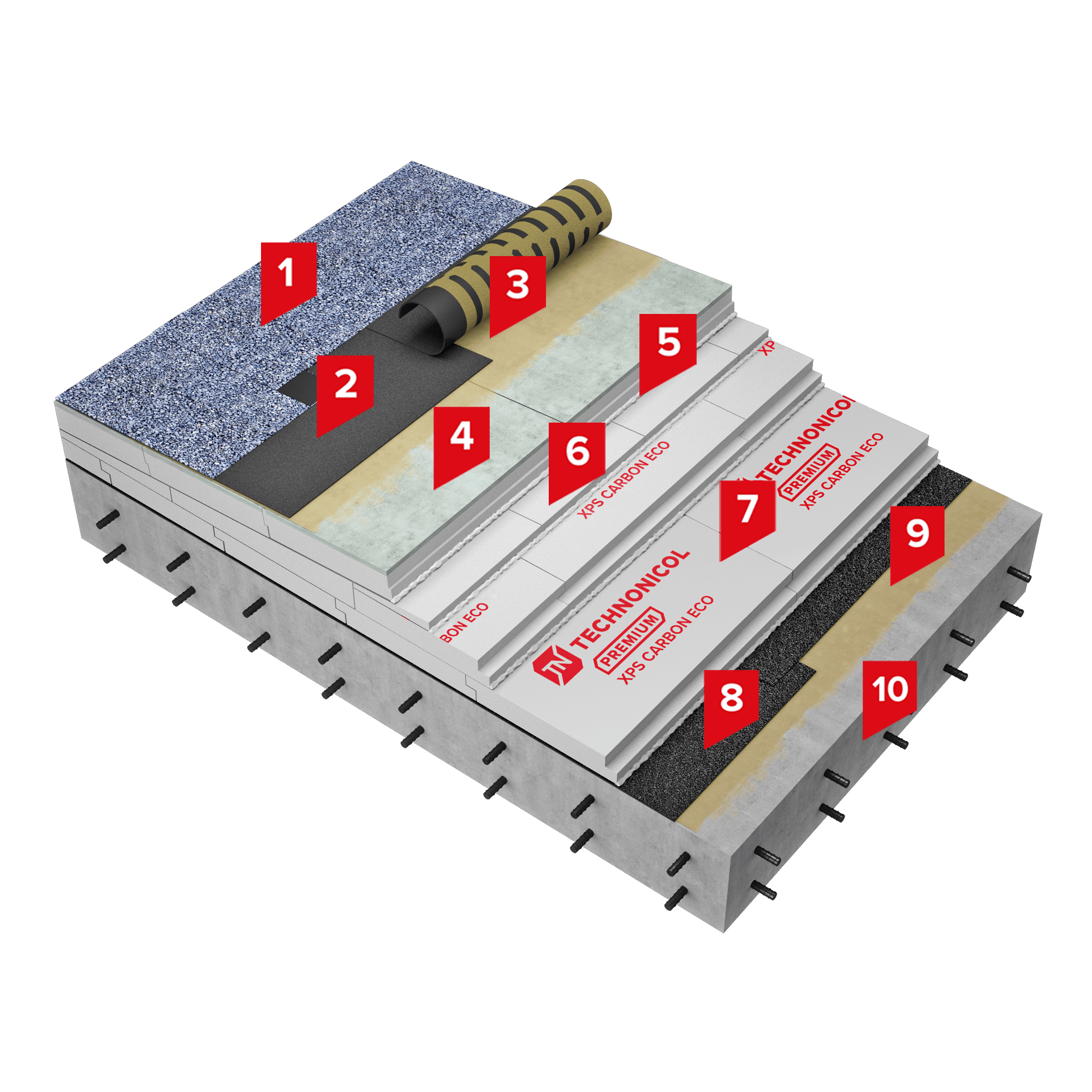 В конструкции применены в качестве нижнего слоя теплоизоляционные плиты из экструзионного пенополистирола ТЕХНОНИКОЛЬ CARBON ECO, в качестве верхнего теплоизоляционного слоя - ТЕПЛОСТЯЖКА (Сэндвич ТЕХНОНИКОЛЬ Ц-XPS). Теплоизоляционные плиты приклеиваются к пароизоляционному слою и между собой на клей-пену ТЕХНОНИКОЛЬ PROFESSIONAL для пенополистирола. Панели теплоизоляционные «Сэндвич ТЕХНОНИКОЛЬ Ц-XPS» представляют собой плиты из экструзионного пенополистирола, покрытые защитным слоем из высокопрочной цементной стяжки. Наличие защитного слоя из высокопрочной цементной стяжки избавляет от необходимости устраивать сборную или цементнопесчаную стяжку, значительно упрощая монтаж и обеспечивает отличные эксплуатационные свойства. При необходимости выполнения на крыше основных и контруклонов используют плиты теплоизоляционные XPS ТЕХНОНИКОЛЬ CARBON PROF SLOPE.