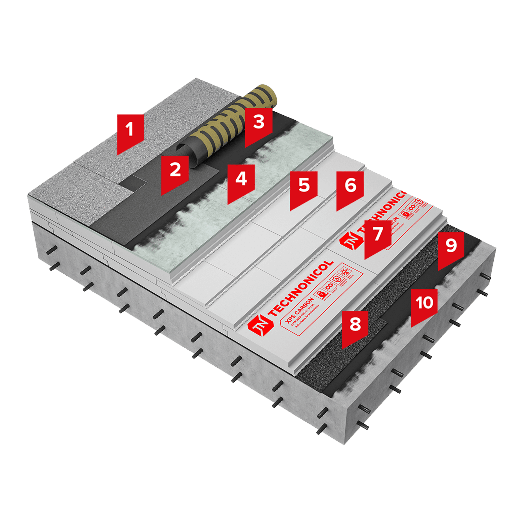 В конструкции применены в качестве нижнего слоя теплоизоляционные плиты из экструзионного пенополистирола ТЕХНОНИКОЛЬ CARBON PROF, в качестве верхнего теплоизоляционного слоя - экструзионный пенополистирол Сэндвич ТЕХНОНИКОЛЬ Ц-XPS. Теплоизоляционные плиты приклеиваются к пароизоляционному слою и между собой на клей-пену ТЕХНОНИКОЛЬ PROFESSIONAL для пенополистирола. Панели теплоизоляционные «XPS Сэндвич ТЕХНОНИКОЛЬ Ц-XPS» представляют собой плиты из экструзионного пенополистирола, покрытые защитным слоем из высокопрочной цементной стяжки. Наличие защитного слоя из высокопрочной цементной стяжки избавляет от необходимости устраивать сборную или цементно-песчаную стяжку, значительно упрощая монтаж и обеспечивает отличные эксплуатационные свойства.