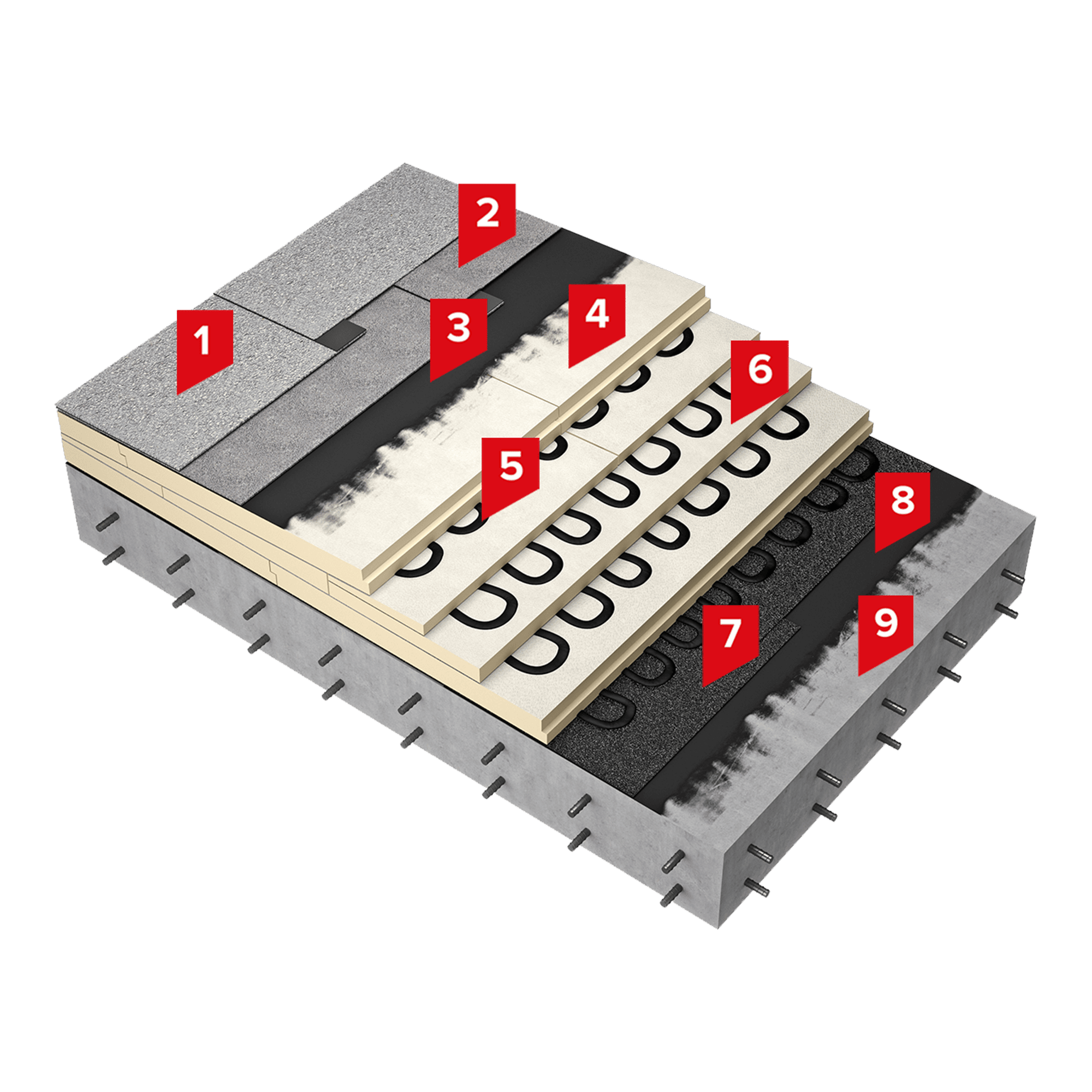 Теплоизоляционный слой в системе выполняется из жестких пенополиизоциануратных плит LOGICPIR PROF СХМ/СХМ, которые приклеиваются к пароизоляционному на горячий битум или мастику. При необходимости выполнения на крыше основных и контруклонов используют плиты теплоизоляционные LOGICPIR SLOPE.