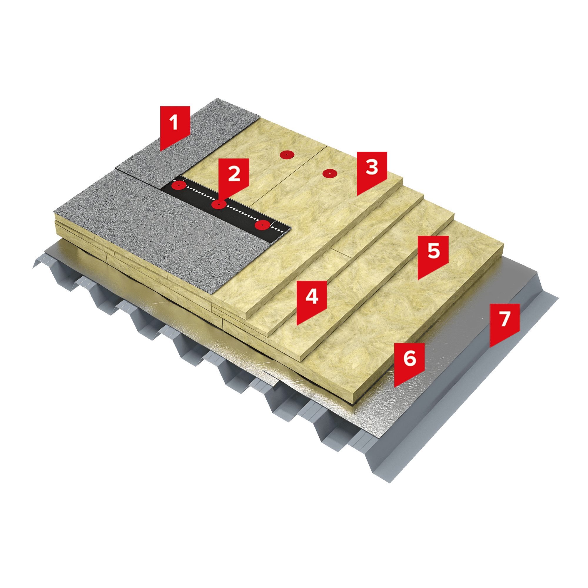 В конструкции применяются две серии плит ТЕХНОРУФ из каменной ваты: ТЕХНОРУФ В ОПТИМА в качестве верхнего теплоизоляционного слоя и ТЕХНОРУФ В ПРОФ – в качестве нижнего слоя. Плиты ТЕХНОРУФ В ОПТИМА и ТЕХНОРУФ В ПРОФ имеют высокую плотность, что обеспечивает восприятие и распределение нагрузки, действующей на поверхность кровли в ходе регулярного обслуживания оборудования, размещенного на ней.