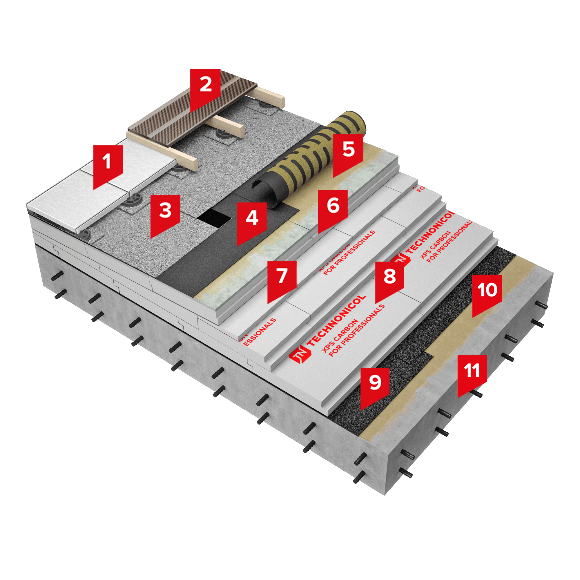 В качестве балласта и эксплуатируемого слоя в системе рекомендуется использовать - тротуарную плитку, толщиной не менее 40 мм, установленную на регулируемые опоры. Кровельный ковер состоит из двух слоев битумно-полимерного материала. В системе используется двухслойный «дышащий» битумно-полимерный кровельный ковер, который позволяет избежать образования вздутий на ее поверхности, за счет применения в качестве нижнего слоя специальный материал Унифлекс ВЕНТ ЭПВ. Верхний слой из битумно-полимерного материала Техноэласт К ЭКП наплавляется на нижний слой кровли.