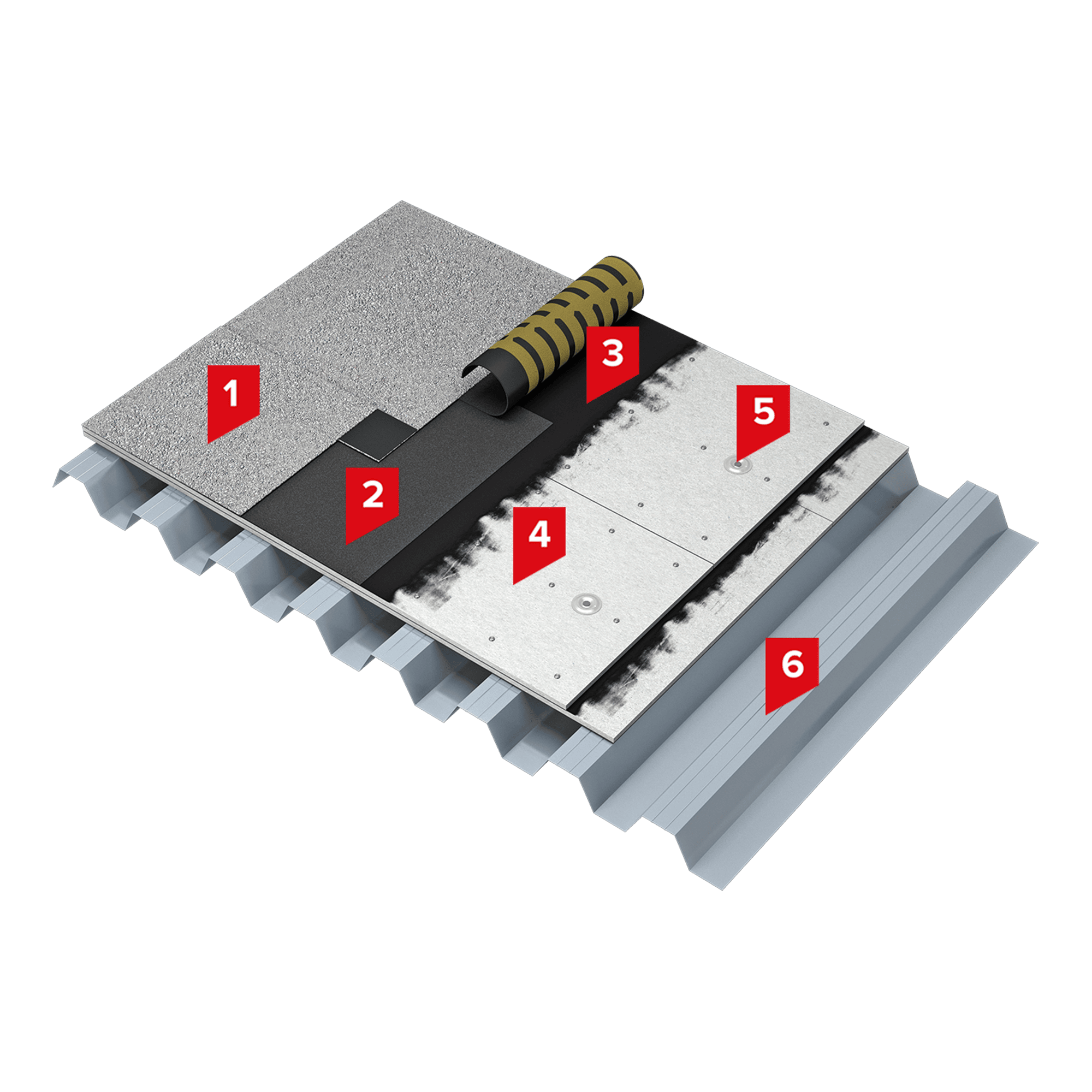Высокая поверхностная прочность системы достигается за счет применения в системе сборной стяжки из двух слоев хризотилцементных прессованных плоских листов толщиной 10 мм. Для увеличения адгезии битумно-полимерного материала к поверхности и для того, чтобы не допустить коробления, листы сборной стяжки должны обязательно грунтоваться со всех сторон праймером. Листы сборной стяжки укладываются с разбежкой швов и с механическим креплением слоев между собой и к профилированному листу, что обеспечивает системе надёжность.