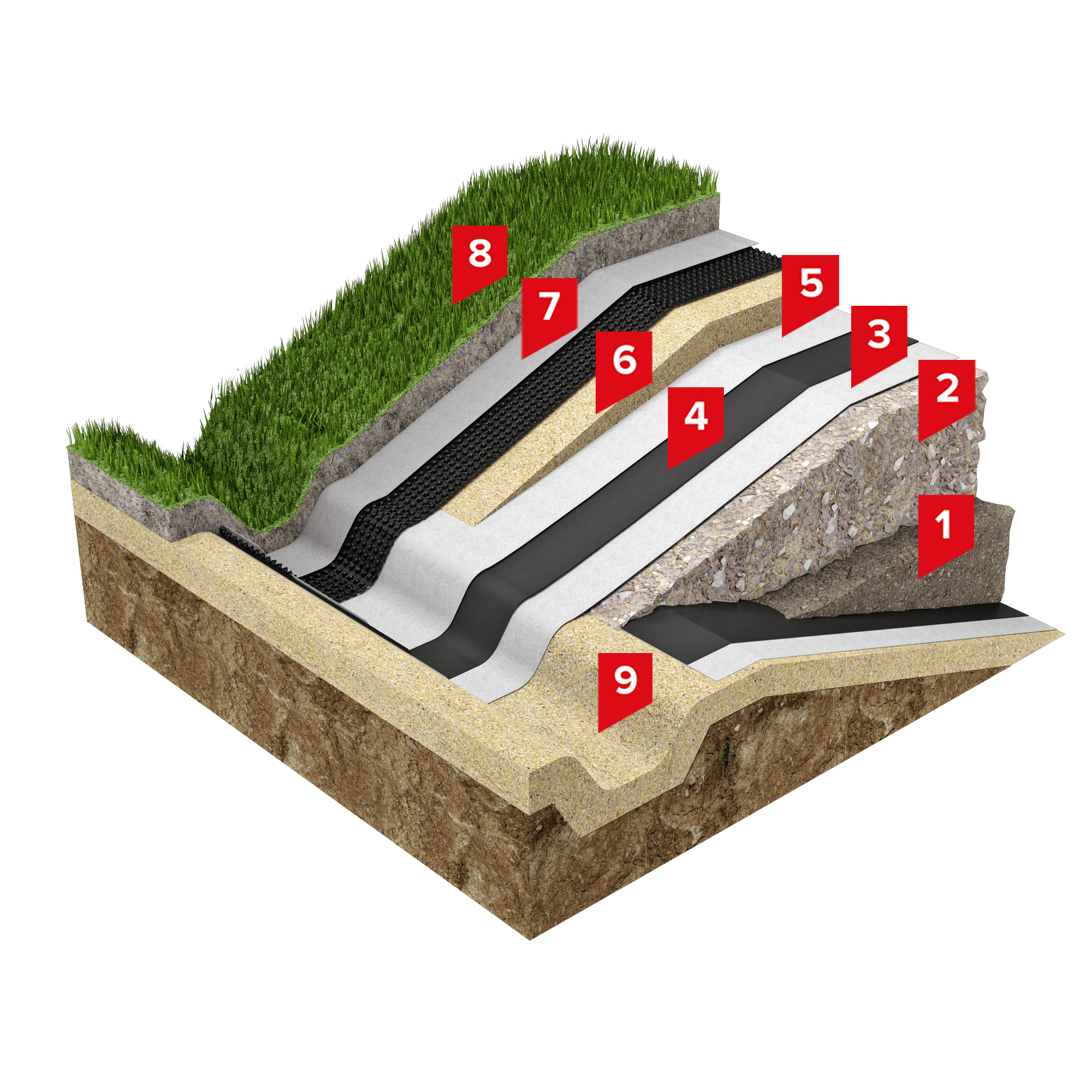 Для обеспечения сохранности геомембраны в процессе монтажа и подготовки основания под дренажный слой необходимо выполнить песчаную отсыпку толщиной не менее 200 мм. Поверх песчаного слоя укладывается дренажный геокомпозит ПЛАНТЕР 2Д, обеспечивающий высокую водопропускную способность и эффективный отвод атмосферных осадков к водоотводящим траншеям. Далее устраивается рекультивационный слой грунта не менее 0,4 м, включая 0,2 м плодородного грунта.