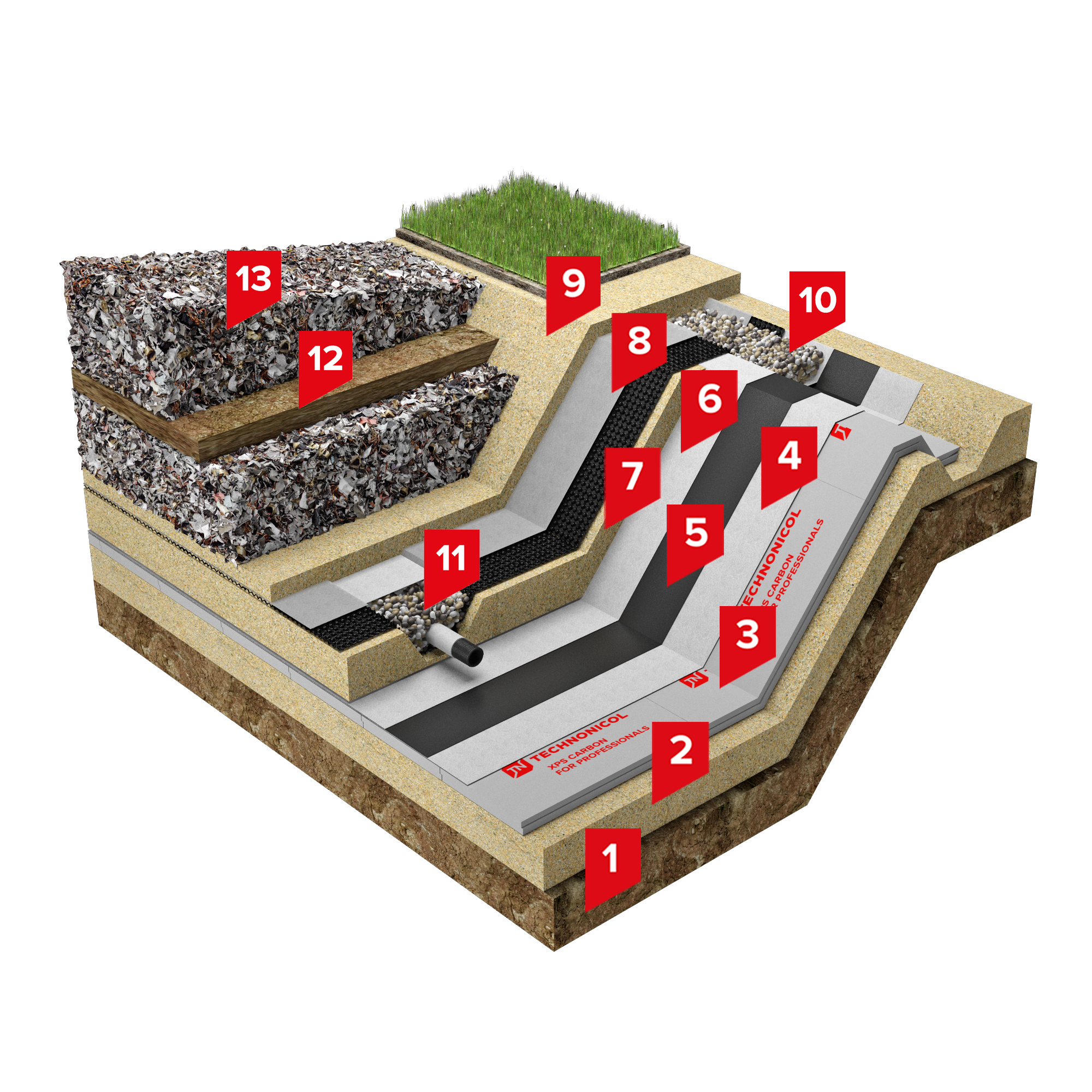 Система предназначена для устройства изоляции и дренажного слоя в ложе полигонов для размещения и захоронения бытовых (ТБО), твердых коммунальных (ТКО) и промышленных отходов. Основным гидроизоляционным слоем является геомембрана ГЕОПРУФ, выполненная из высококачественного полиэтилена. Абсолютная водонепроницаемость геомембраны исключает проникновение фильтрата в грунтовое основание и загрязнение окружающей среды. Для эффективного отвода фильтрата используется дренажный геокомпозит ПЛАНТЕР 2Д.