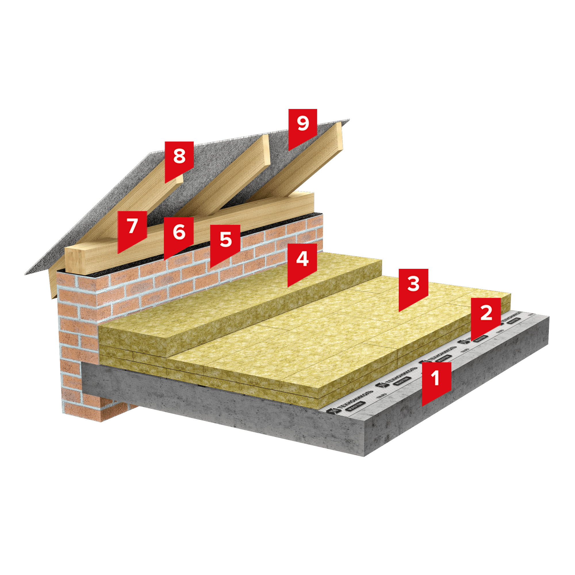 Для теплоизоляции применяются плиты из каменной ваты марки ТЕХНОРУФ Н ПРОФ с прочностью на сжатие при 10 % деформации не менее 45 кПа, что позволяет значительно снизить вероятность повреждение материала в процессе эксплуатации. Для эффективной эксплуатации поверх теплоизоляционного слоя укладываются ходовые доски, которые располагаются так, чтобы обеспечить подходы от входа в чердачное помещение ко всему оборудованию и конструкциям, требующим периодического обслуживания (задвижки на трубопроводах, воздухосборникам и т.п.), а также к выходам на кровлю.