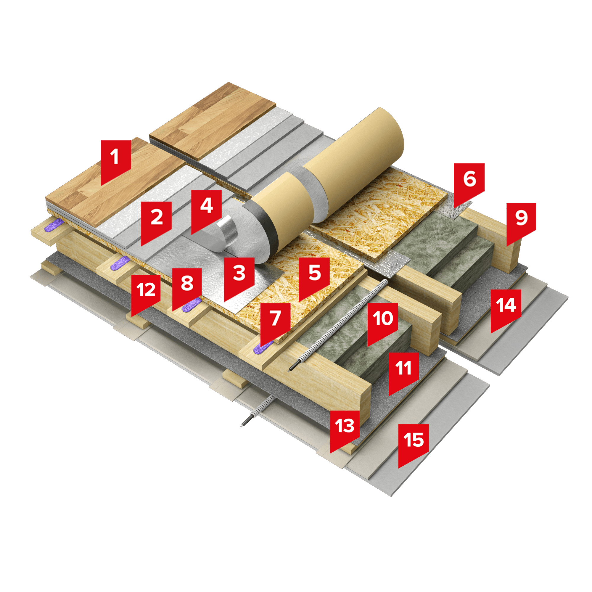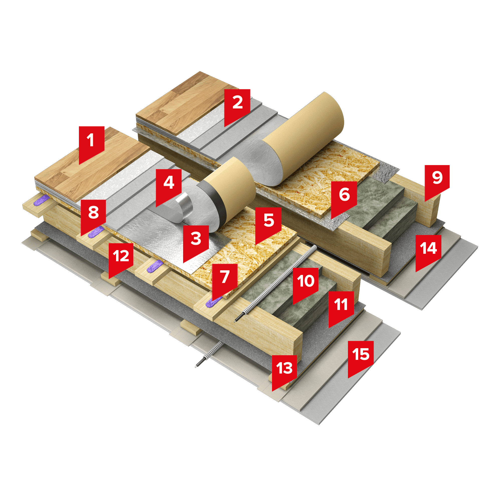 Пространство между деревянными балками заполнено плитами из каменной ваты ТЕХНОАКУСТИК или минеральной изоляции на основе стекловолокна ТЕХНОНИКОЛЬ Теплый каркас ПРОФ. Поверх балок выполняется сплошной настил чернового пола из листовых материалов. В качестве разделительного слоя между балками / обрешеткой и черновым полом укладывается звукоизоляционный битумно-полимерный материал Техноэласт АКУСТИК СУПЕР. Также возможно применение клея ТЕХНОНИКОЛЬ 508 PROFESSIONAL для жесткого соединения элементов конструкции между собой.