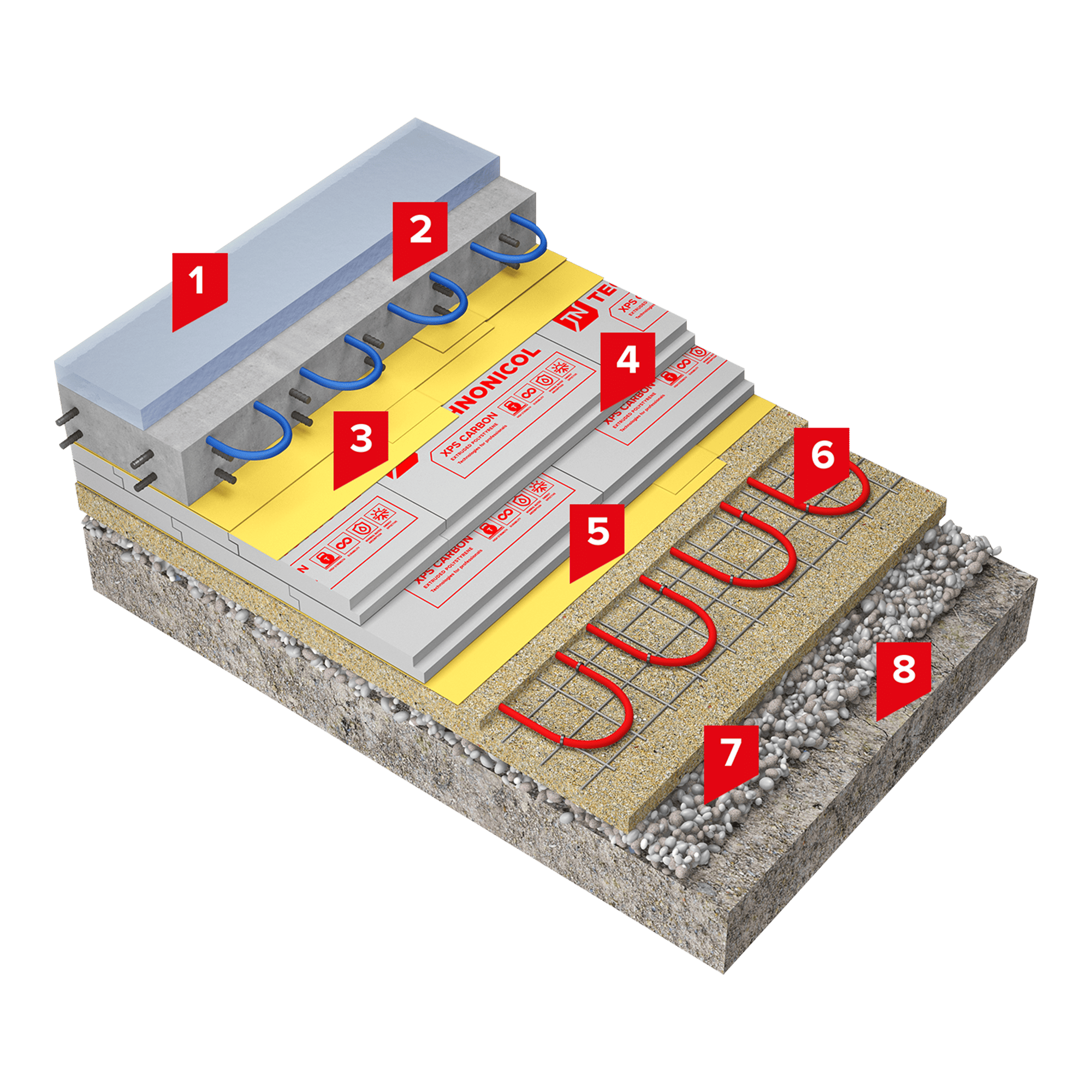 Системы изоляции залов ледовых арен и катков, устраиваемых по грунту, требуется проектировать с учетом предотвращения промерзания грунтов основания. Для этого, в том числе, следует применять системы искусственного обогрева грунтов. Повышение эффективности таких систем обеспечивается путем устройства теплоизолирующего слоя плитами из экструзионного пенополистирола ТЕХНОНИКОЛЬ CARBON PROF над слоем с нагревательными элементами.