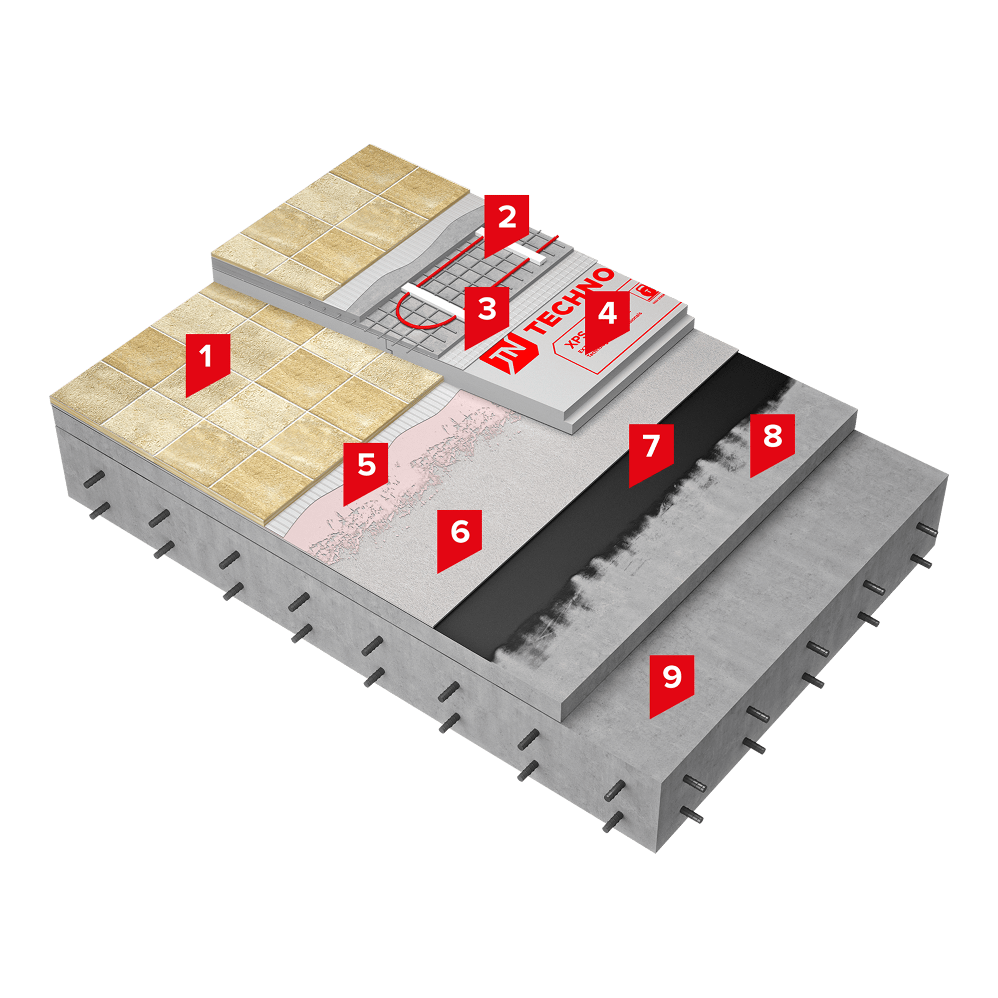 Сверху гидроизоляционного слоя возможна укладка цементно-песчаной стяжки с покрытием пола из плитки, либо утепленный вариант: поверх плит из экструзионного пенополистирола ТЕХНОНИКОЛЬ CARBON ECO укладывается цементно-песчаная стяжка с нагревательными элементами.