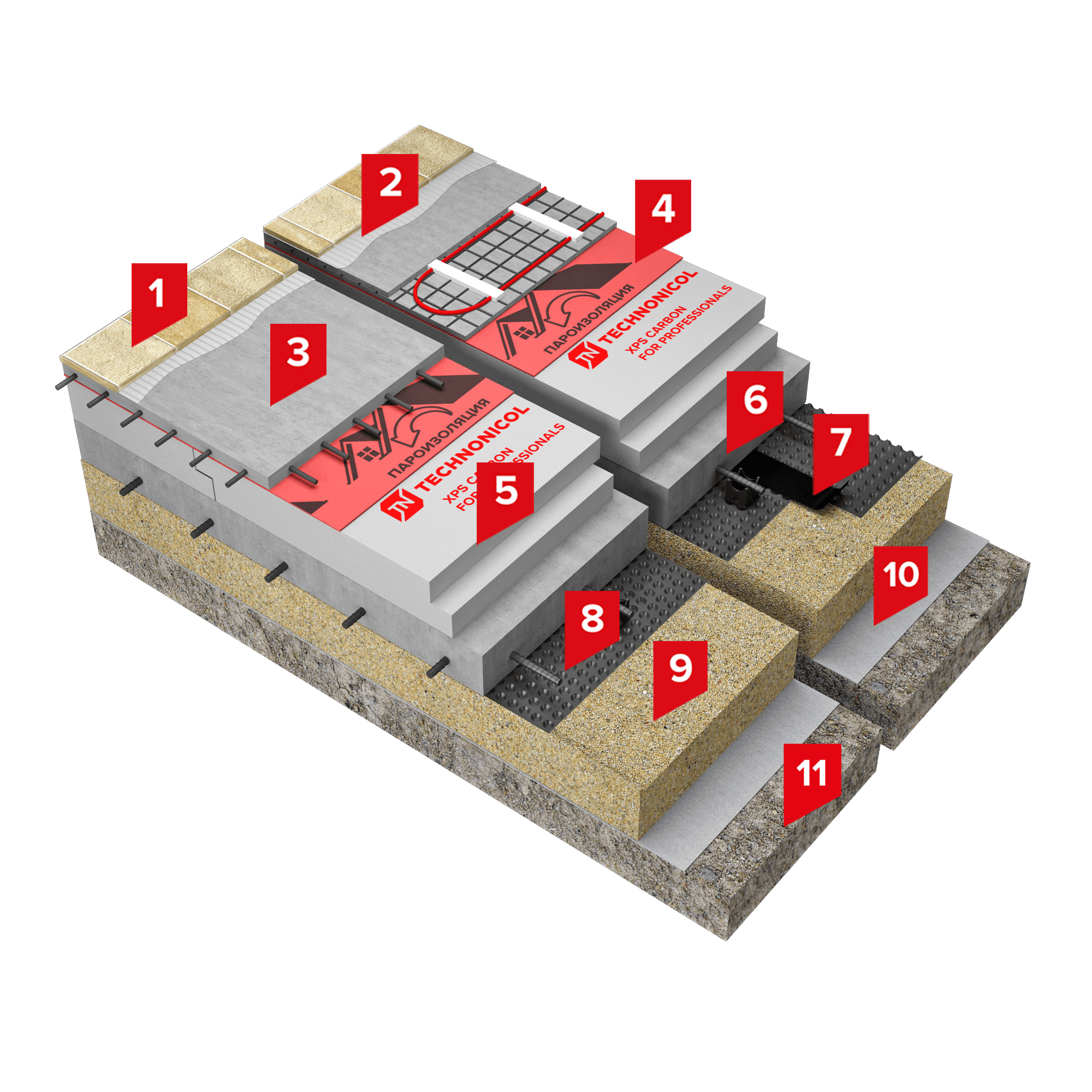 На железобетонную плиту укладывается теплоизоляционный слой из экструзионного пенополистирола ТЕХНОНИКОЛЬ CARBON ECO, поверх которого монтируется пароизоляционная пленка ТехноНИКОЛЬ МАСТЕР БАРЬЕР 1.0, предотвращающая также вытекание цементного молочка из стяжки под чистовое покрытие. В данной системе возможно применять цементно-песчаную стяжку с нагревательными элементами. Применение слоя из экструзионного пенополистирола толщиной всего 30 мм позволяет существенно снизить потери тепловой энергии в нежелательных направлениях за счет высоких теплоизоляционных характеристик, что повышает до максимума эффективность теплоизлучающего слоя (электронагревателей).