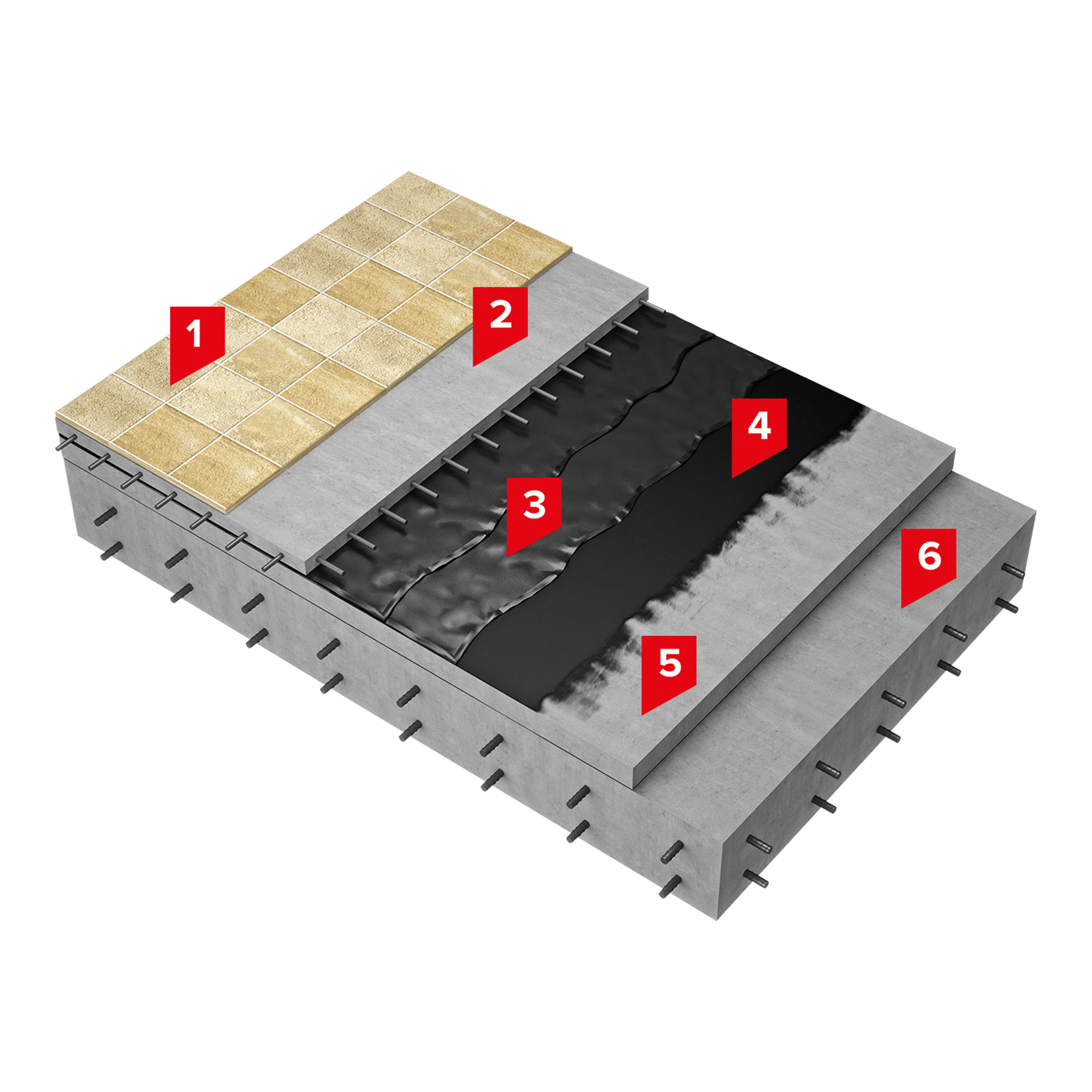 Данная система состоит из мастичного гидроизоляционного слоя, нанесённого на предварительно огрунтованное основание, а также выравнивающей стяжки и финишной отделки.