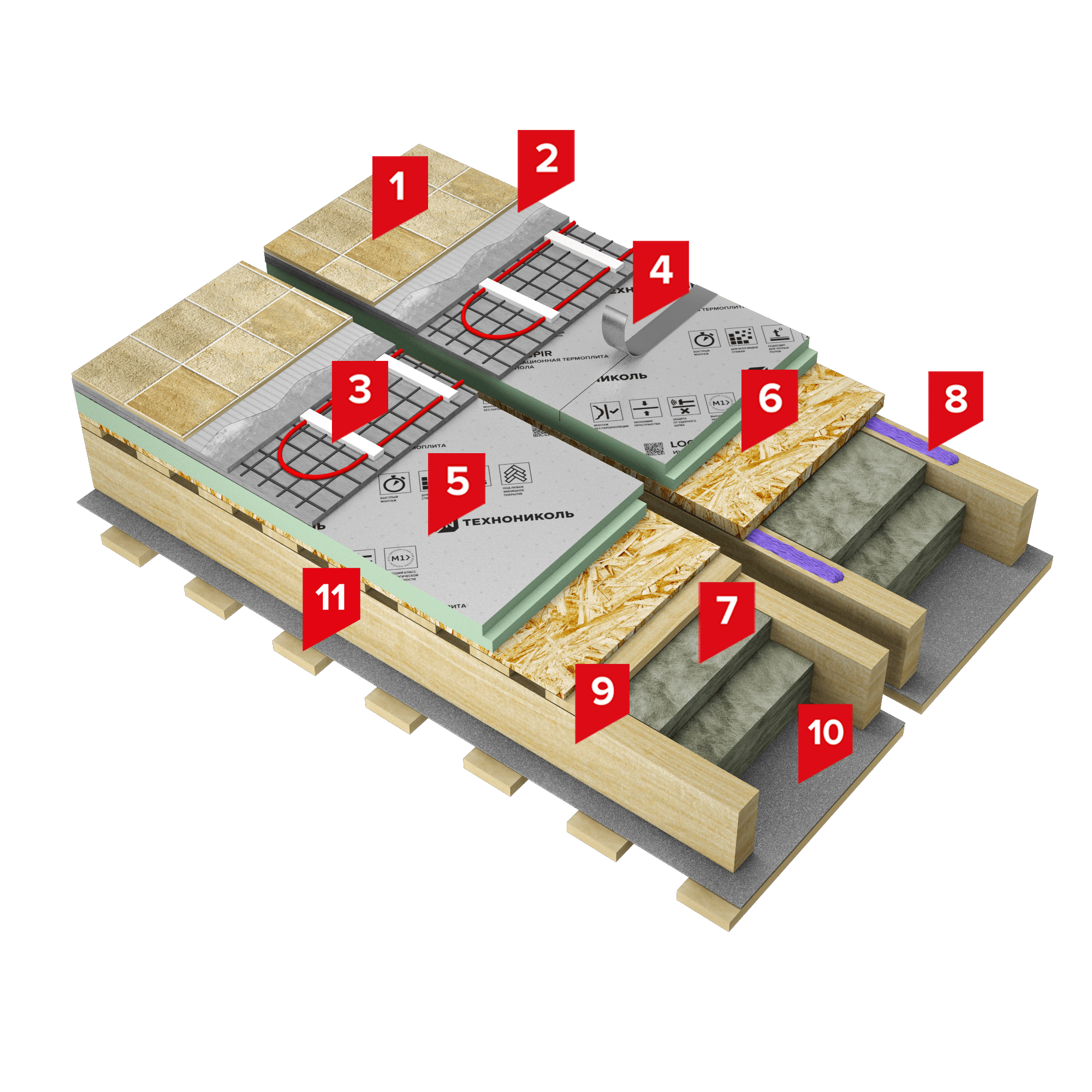 Изоляционная система пола, предназначенная для обогрева и/или создания комфортной температуры напольного покрытия при помощи интегрированных нагревательных элементов в помещениях различного функционального назначения в деревянном домостроении.