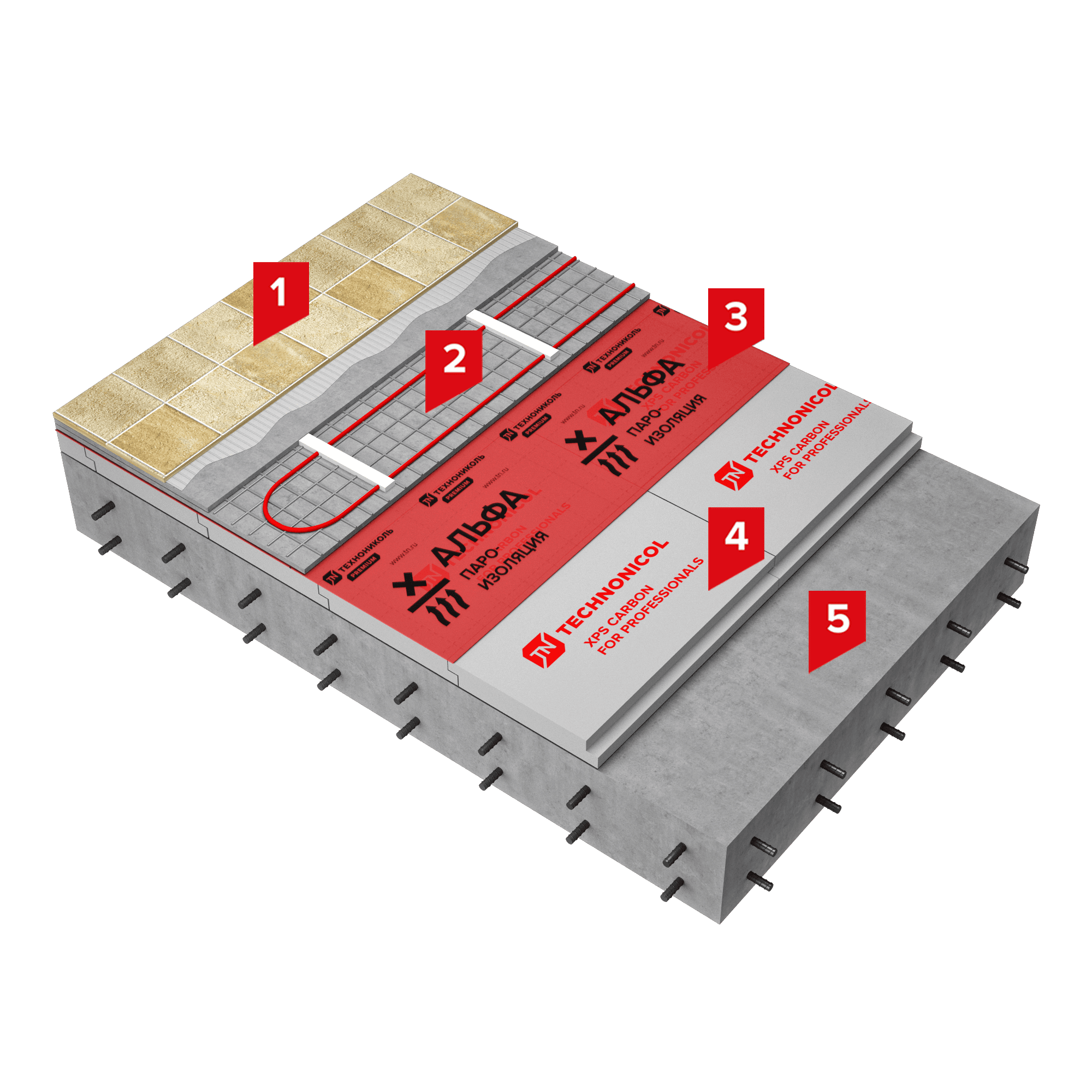 Система «теплого пола» включает в себя устройство слоя с нагревательными элементами поверх эффективного теплоизоляционного слоя ТЕХНОНИКОЛЬ CARBON ECO, уложенного на выровненное основание. Это решение увеличивает теплоотдачу в сторону отапливаемого помещения. Сверху на теплоизоляционный слой укладывается пароизоляционная пленка, предотвращающая вытекание цементного молочка из стяжки. Система ТН-ПОЛ Термо КМС позволяет сократить уровень ударного шума до 28 дБ всего при использовании экструзионного пенополистирола и подложки из геотекстиля.