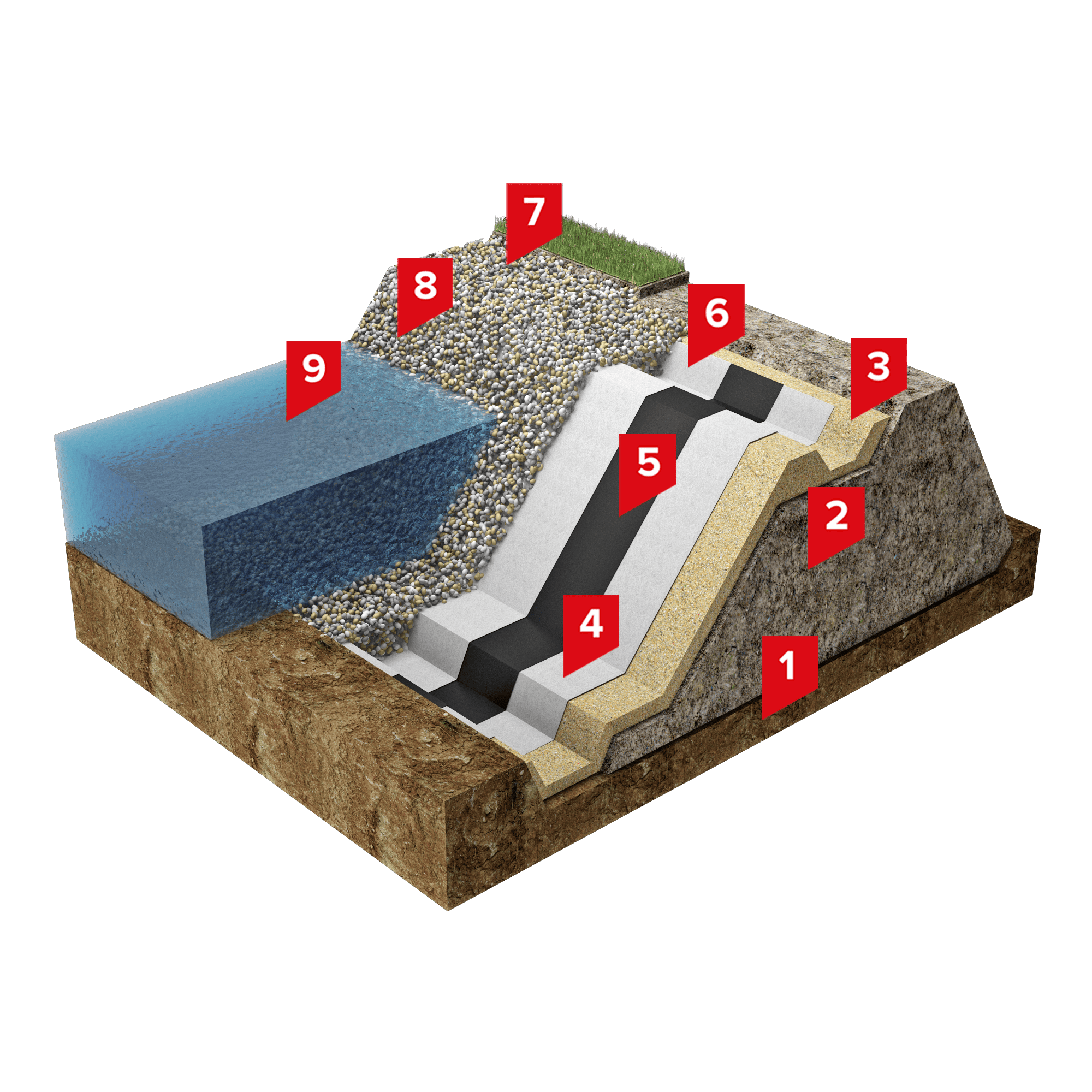 Система применяется для устройства ПФЭ в плотинах и защитных дамбах из грунтовых материалов для создания подпертого верхнего бьефа в водохранилище, а также для защиты территорий от наводнений и затоплений. Использование геомембраны ГЕОПРУФ позволяет снизить к минимуму фильтрационные поток в теле плотины или защитной дамбы, минимизировать фильтрационные потери и аккумулировать полезные объемы воды на водном объекте.