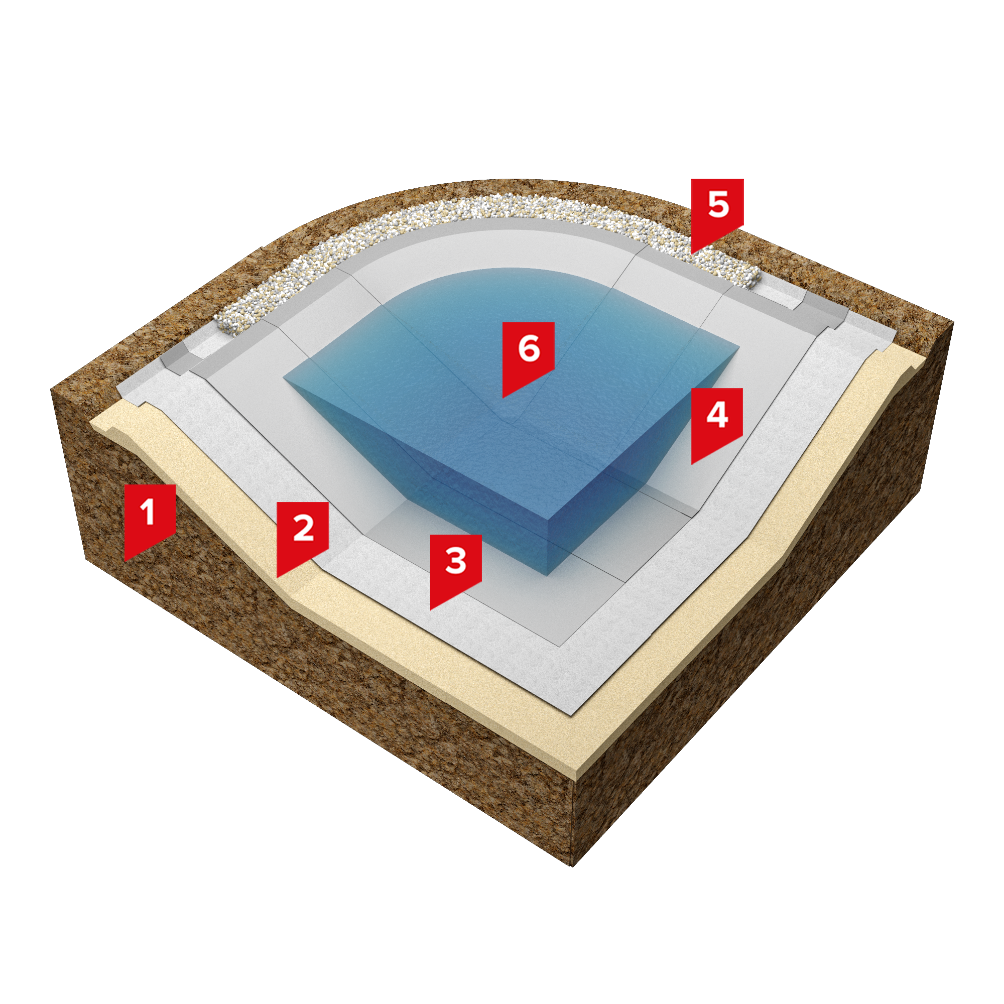 Швы полотен гидроизоляционной мембраны, скрепляются путем сварки горячим воздухом при помощи автоматического сварочного оборудования. Швы имеют особую конструкцию, т.к. они формируются после разогрева двумя прижимными роликами, между которыми имеется воздушный зазор около 15÷20 мм. Таким образом формируется двойной шов с центральным воздушным (проверочным) каналом, позволяющим контролировать герметичность швов. Герметичность швов проверяется давлением воздуха, который нагнетается в проверочный канал при помощи компрессора и специальной полой иглы. Для этого проверочный канал герметично заваривается по краям шва. После чего в него вводится проверочная игла. Проверочная игла со встроенным манометром и краном соединяется с компрессором или насосом для подачи воздуха. В проверочный канал подается воздух и создается избыточное давление воздуха от 1,5 до 2 бар. Такой метод инструментальной проверки всегда дает 100%-ный результат. В качестве подстилающего слоя в системе применяется геотекстильный материал с поверхностной плотностью 300 или 500 г/м², который монтируется непосредственно на спланированное грунтовое основание. При необходимости грунтовое основание может быть подготовлено при помощи отсыпки слоя песка. Крепление гидроизоляционной мембраны обеспечивается ее засыпкой в анкерной траншее. Защитный слой мембраны в случае необходимости может быть выполнен из геотекстильного материала с поверхностной плотностью 300 или 500 г/м² с последующей послойной отсыпкой на его поверхность мелкозернистого песка и щебня. Система может быть так же смонтирована с защитным слоем из монолитного бетона.