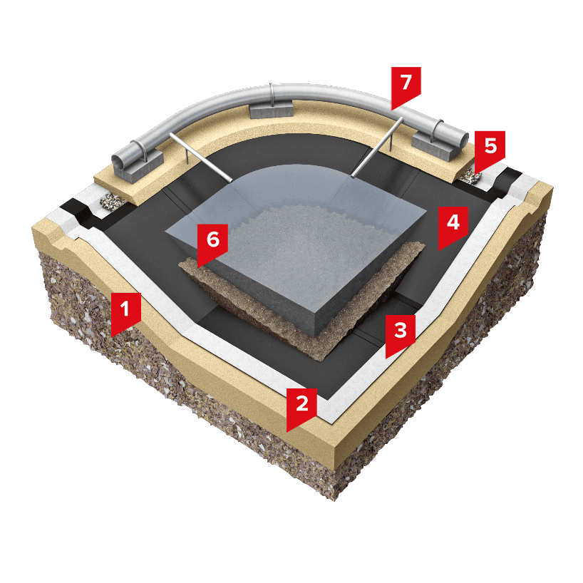 Крепление геомембраны в верхней части обваловки обеспечивается засыпкой балластными материалами в анкерной траншее. Дополнительно может использоваться механическое анкерное крепление. Защитный слой мембраны в случае необходимости может быть выполнен из геотекстильного материала ТЕХНОНИКОЛЬ ПРОФ 500 с последующей послойной отсыпкой на его поверхность мелкозернистого песка, щебня или намывных хвостовых отложений . Толщина защитного слоя на откосах должна быть не менее 800 мм, на дне не менее 500 мм. Система может быть также смонтирована с защитным слоем из монолитного или сборного железобетона.