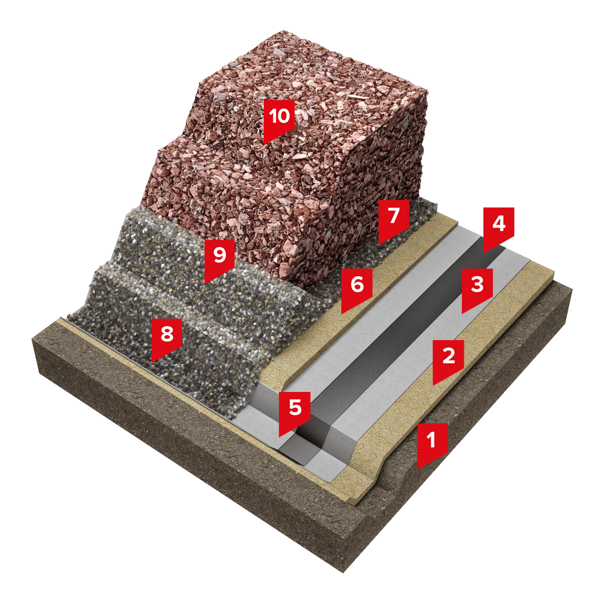 В системе предусмотрен подготовительный слой, выполненный из песка толщиной от 0,1 до 0,3 м с уклоном в сторону водосбросных траншей для оптимальной работы вышележащего пластового дренажа. В качестве разделительного слоя в системе применяется геотекстиль иглопробивной термофиксированный ТЕХНОНИКОЛЬ ПРОФ 500, который монтируется непосредственно на подготовительный слой.